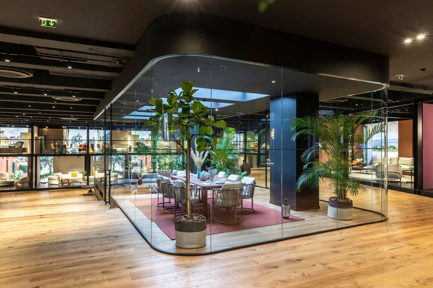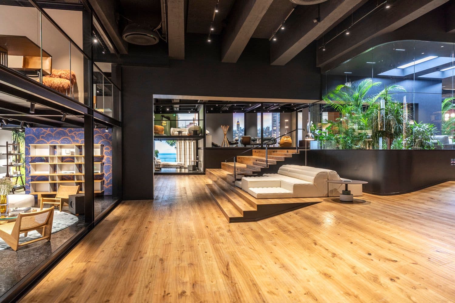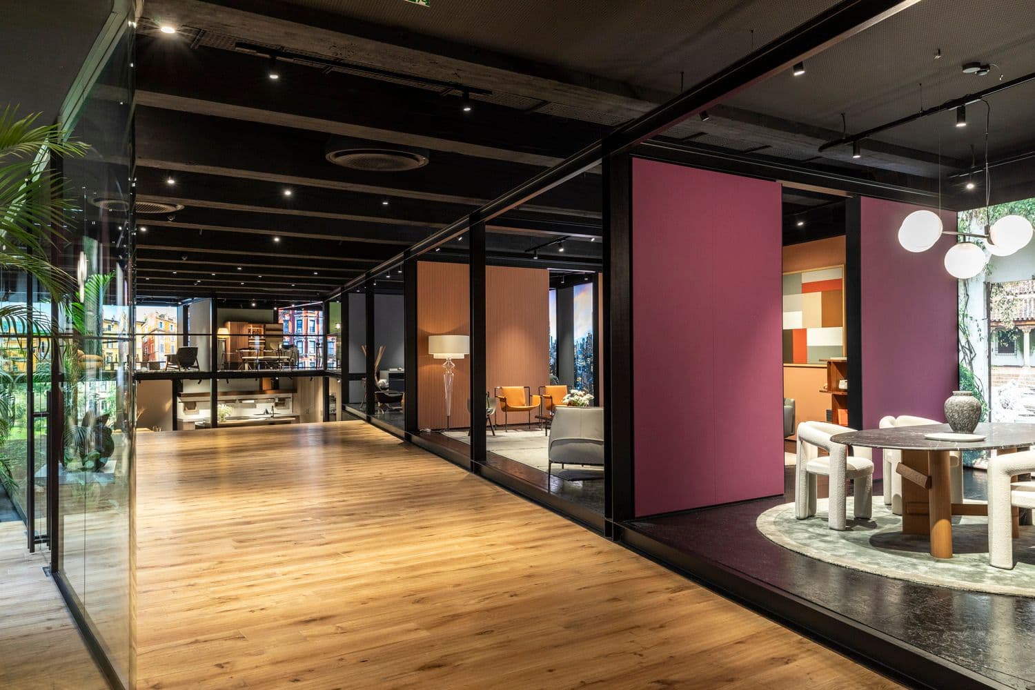 Lo showroom integra due negozi monobrand già esistenti, Poltrona Frau e Cassina, adiacenti e tra loro collegati, insieme a un nuovo monobrand Vitra, all’interno di un unico organismo articolato di 1.410 mq. Una quinta scenografica avvolge il perimetro su tre lati, articolandosi in una composizione modulare di ventisei stanze espositive, a singola e doppia altezza. Al centro, un “giardino virtuale” definisce uno spazio dedicato agli arredi outdoor.