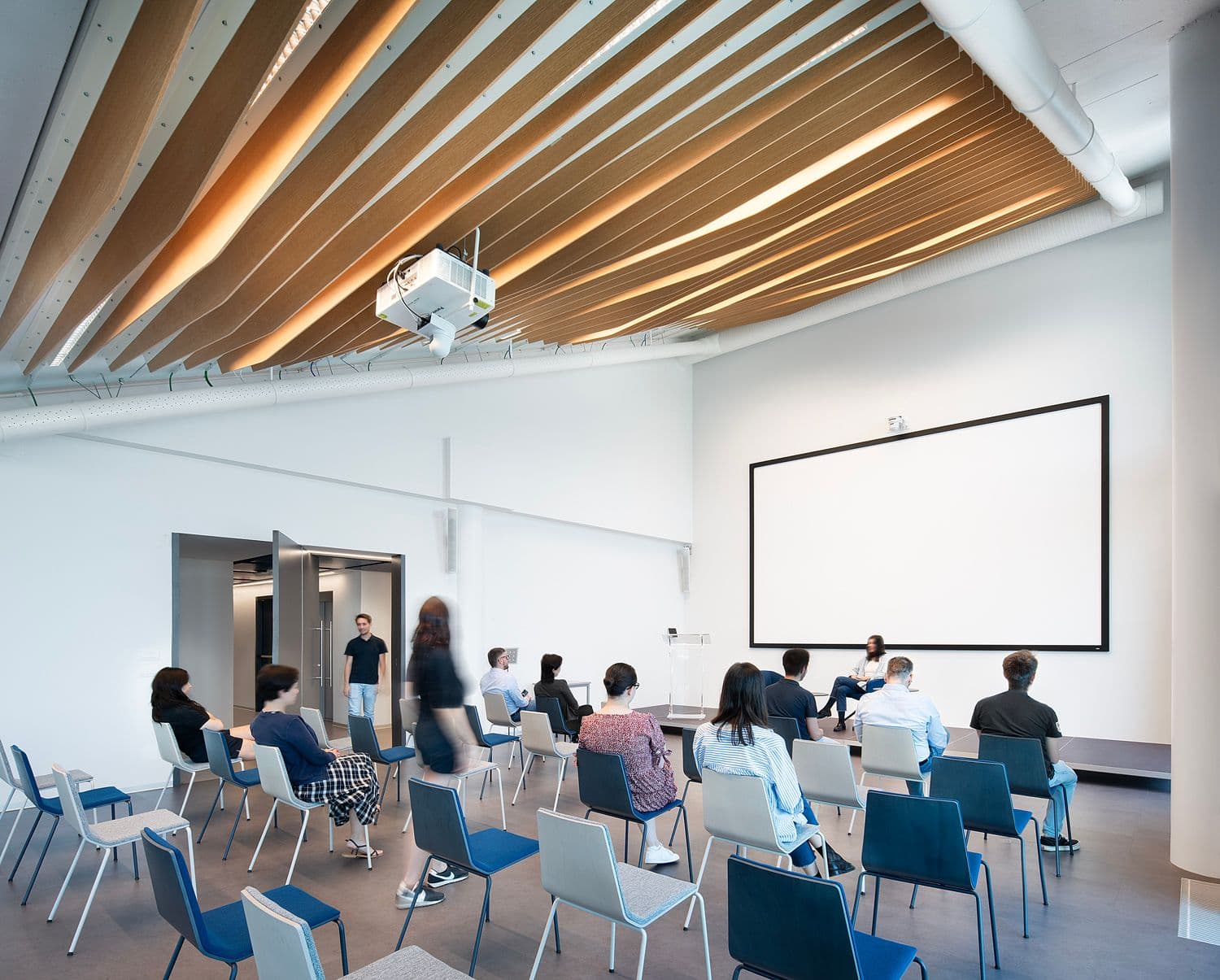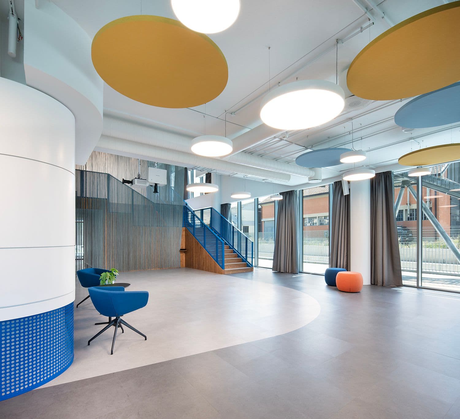 Il progetto riqualifica uno spazio inizialmente basato su un impianto rigido, riconfigurandolo in chiave modulare e flessibile. Al piano terra trovano posto reception, info point, corridoio esperienziale e training room divisibile pensata per attività formative in gruppo, mentre schermi interattivi accompagnano i percorsi e supportano l’apprendimento. Una gradonata con controsoffitto specchiato conduce al primo piano, dove si sviluppano un auditorium multifunzionale da oltre 60 posti, uno spazio open per start up e aree touchdown. Il tunnel di collegamento interno è caratterizzato da pannellature acustiche e illuminazione a LED, materiali e finiture scelti per la loro capacità di garantire durabilità, comfort e controllo energetico.