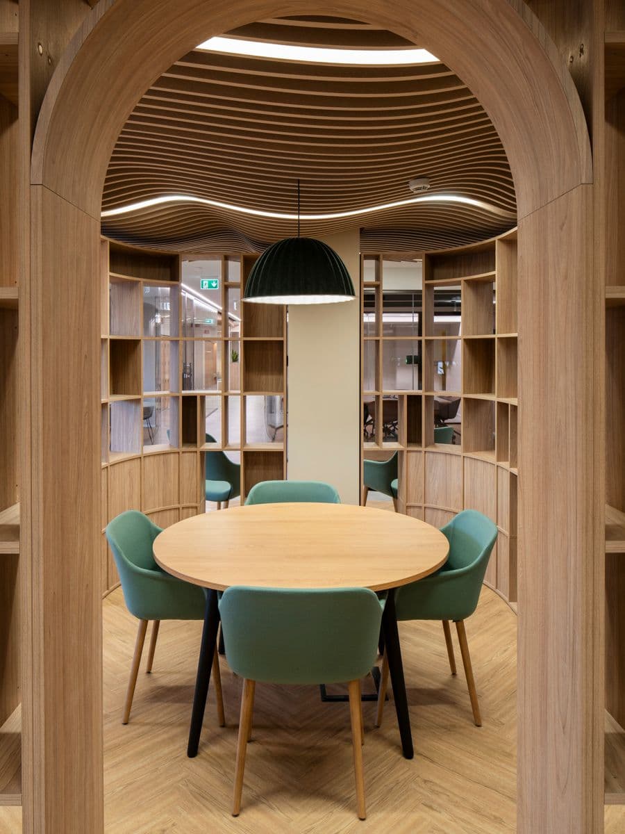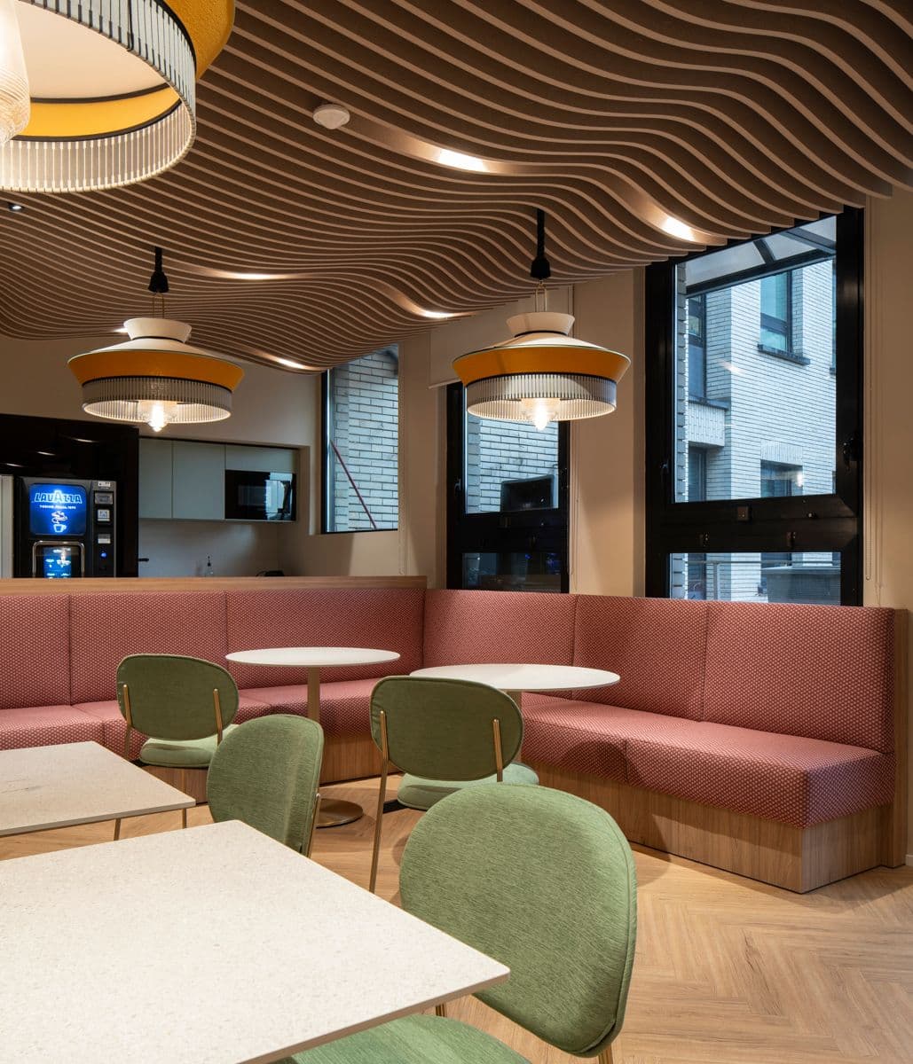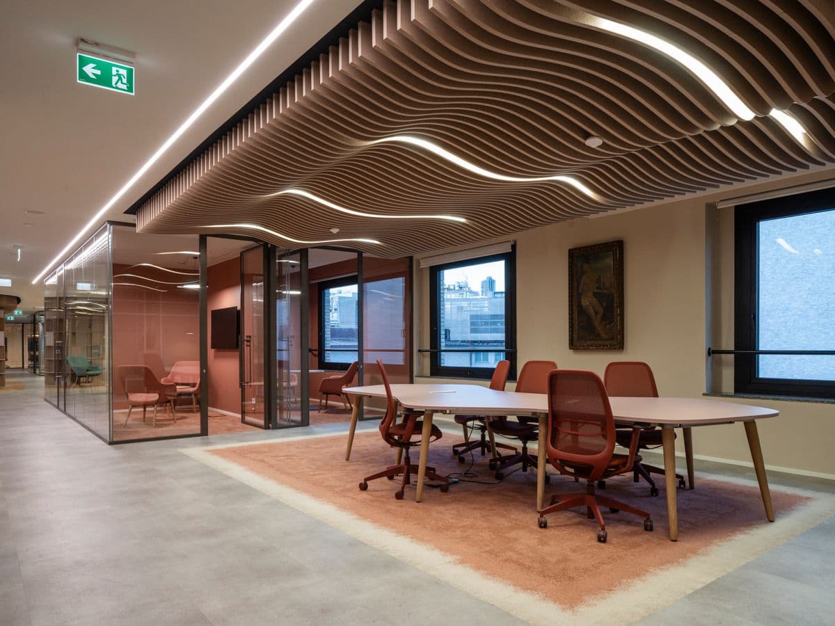 L’intervento riguarda il 3° e 4° piano della struttura, rinnovati per offrire maggiore versatilità e adattabilità alle necessità aziendali, garantendo il massimo comfort anche dal punto di vista acustico, grazie all'impiego di pannelli fonoassorbenti e soffitti progettati ad-hoc.