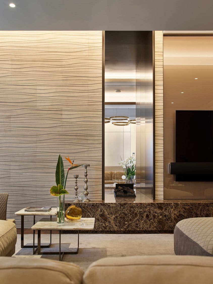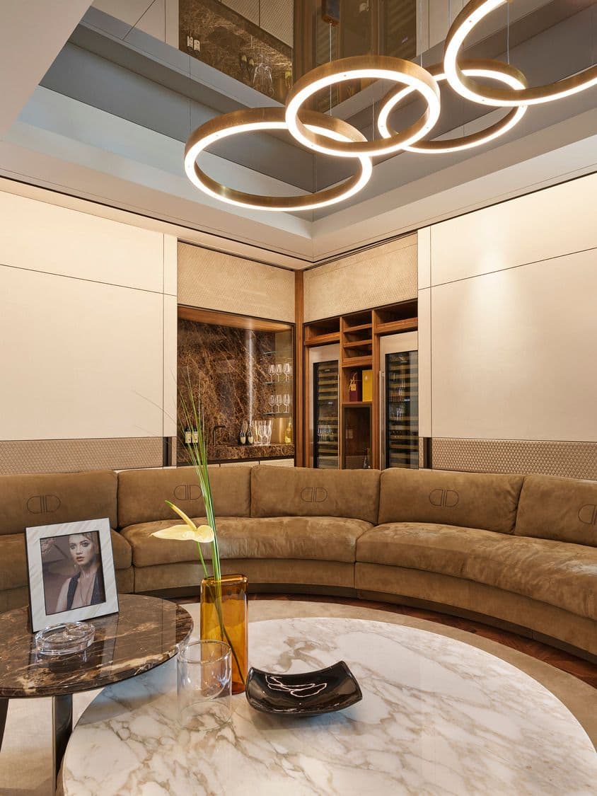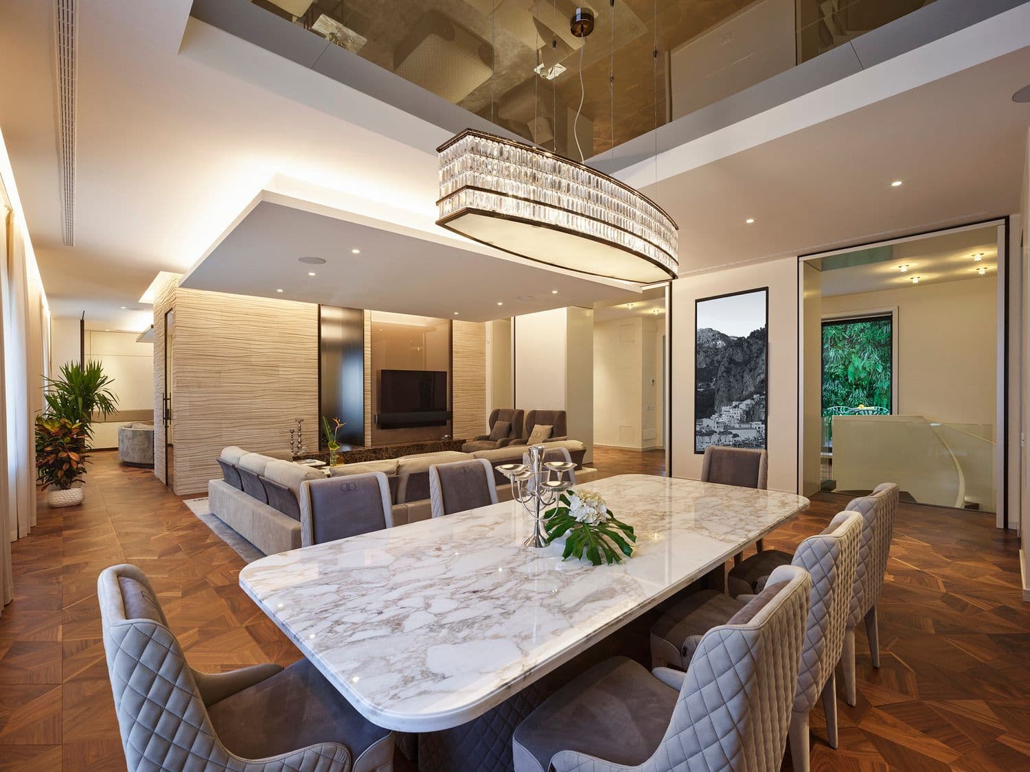 Il progetto costruisce l’identità interna della zona living dell’edificio tramite ambienti scanditi da eleganti modanature e tonalità chiare del bianco e madreperlaceo. La verticalità degli spazi viene enfatizzata dall’uso della pietra chiara e da ampie trasparenze vetrate, con un grande lampadario sospeso che contribuisce a definire l’atmosfera luminosa e rilassata dell’abitazione. Tutti gli elementi sono coordinati per trasmettere una percezione di equilibrio, sobrietà e comfort.