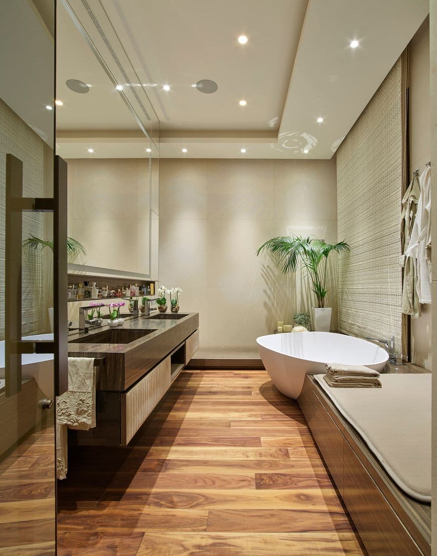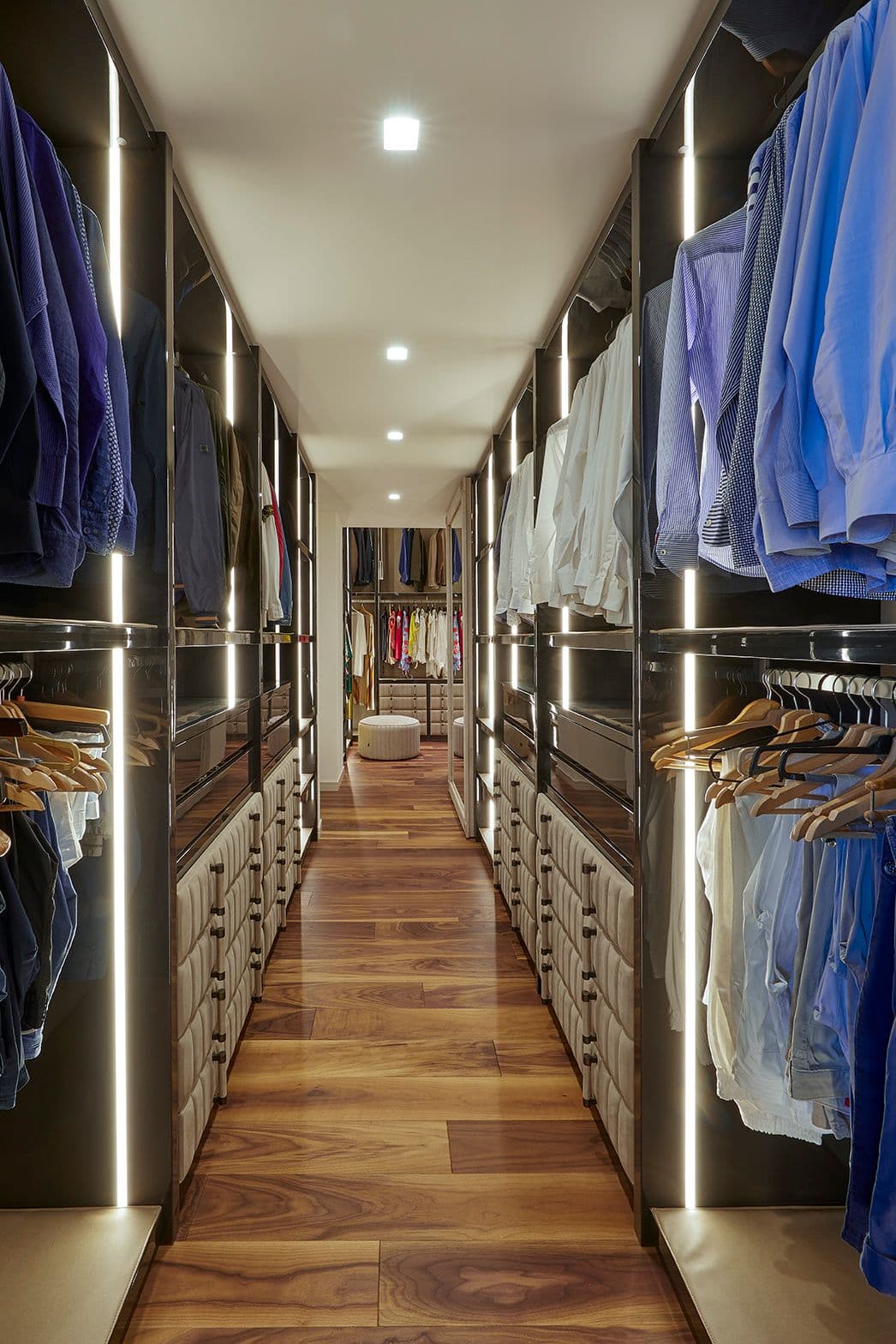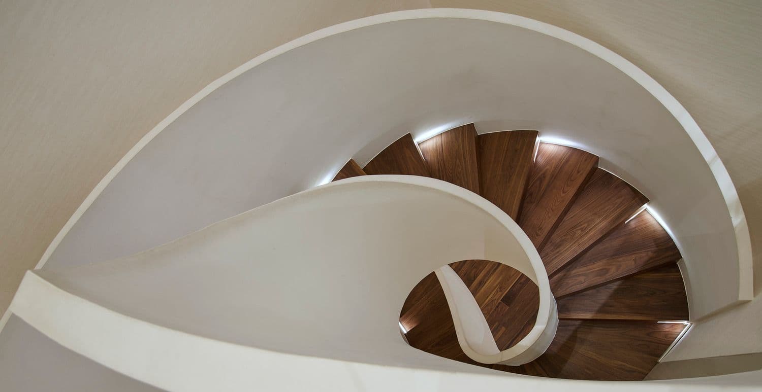 Il progetto costruisce l’identità interna della zona living dell’edificio tramite ambienti scanditi da eleganti modanature e tonalità chiare del bianco e madreperlaceo. La verticalità degli spazi viene enfatizzata dall’uso della pietra chiara e da ampie trasparenze vetrate, con un grande lampadario sospeso che contribuisce a definire l’atmosfera luminosa e rilassata dell’abitazione. Tutti gli elementi sono coordinati per trasmettere una percezione di equilibrio, sobrietà e comfort.