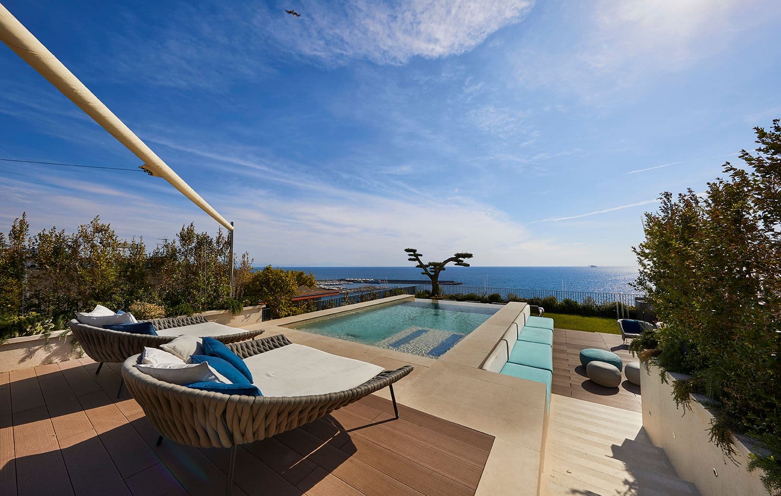 Un importante intervento tecnologico è stato eseguito sul tetto al fine di mascherare l’impiantistica tramite la copertura in piastre con infinity pool che aprono alla vista del Golfo di Salerno e la Costiera amalfitana. Terrazze-giardino di lusso, “way out of this world”.