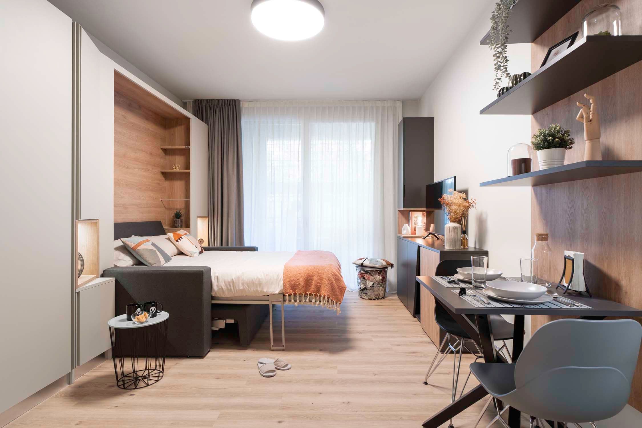 La trasformazione converte un immobile esistente in una struttura residenziale di 261 unità abitative per giovani professionisti, ricercatori e lavoratori in mobilità, organizzate secondo il modello House as a Service. L'intervento ridefinisce gli spazi originali per ospitare appartamenti compatti e aree comuni, supportato da una significativa operazione di efficientamento energetico.
