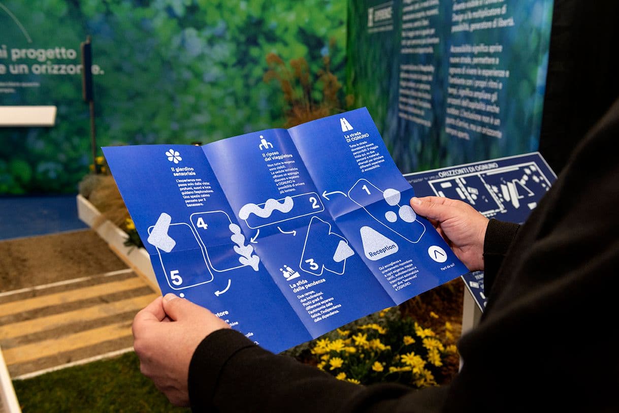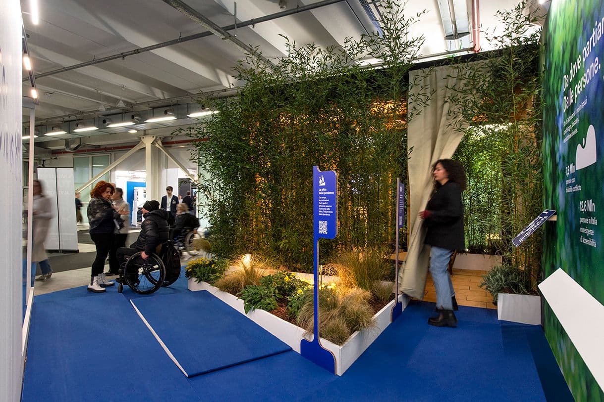 L’allestimento rende l’accessibilità un’esperienza concreta e condivisa, presentando un viaggio outdoor come metafora dell’inclusione.