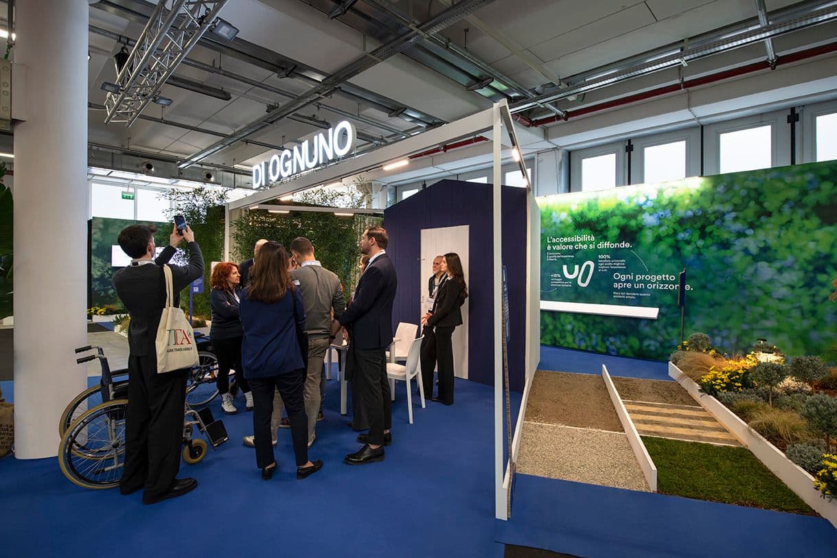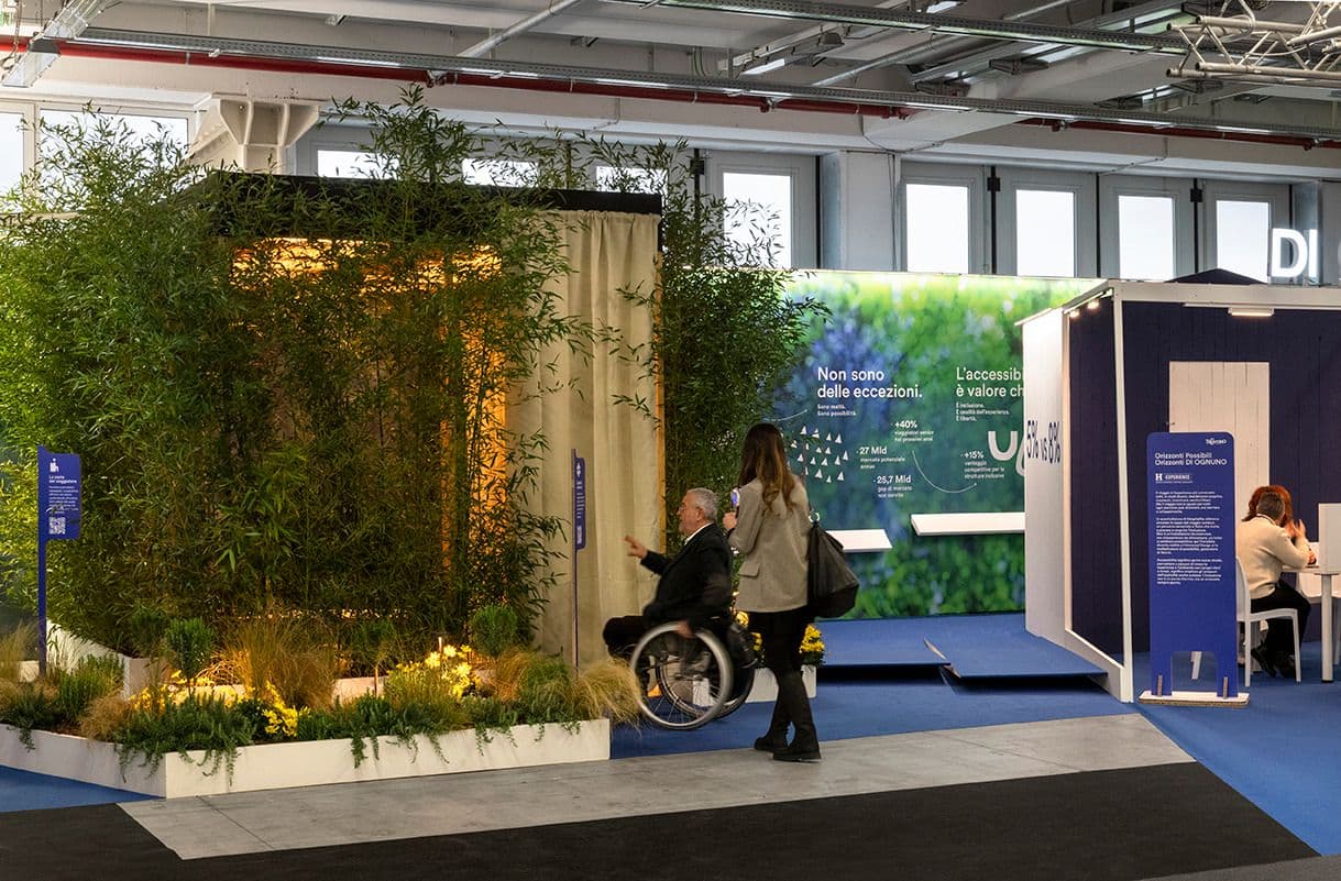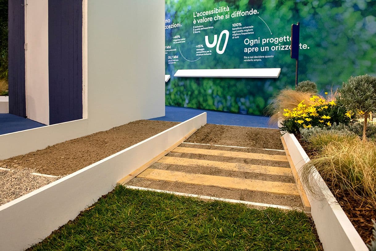 DI OGNUNO – Orizzonti Possibili è un allestimento che trasforma un tradizionale stand in un itinerario a tappe dedicato al turismo open air, realizzato in collaborazione con Village for All – V4A per Hospitality a Riva del Garda. Il progetto, presentato per il terzo anno consecutivo, riproduce situazioni tipiche di campeggi e villaggi: reception accessibile, percorsi con materiali differenziati, rampe con diverse pendenze, giardino sensoriale e aree di sosta. Un sistema di wayfinding multisensoriale integra luce, suono ed essenze come strumenti di orientamento, mettendo il visitatore nelle condizioni di sperimentare scelte progettuali e soluzioni attraverso i sensi e l’esperienza diretta.
