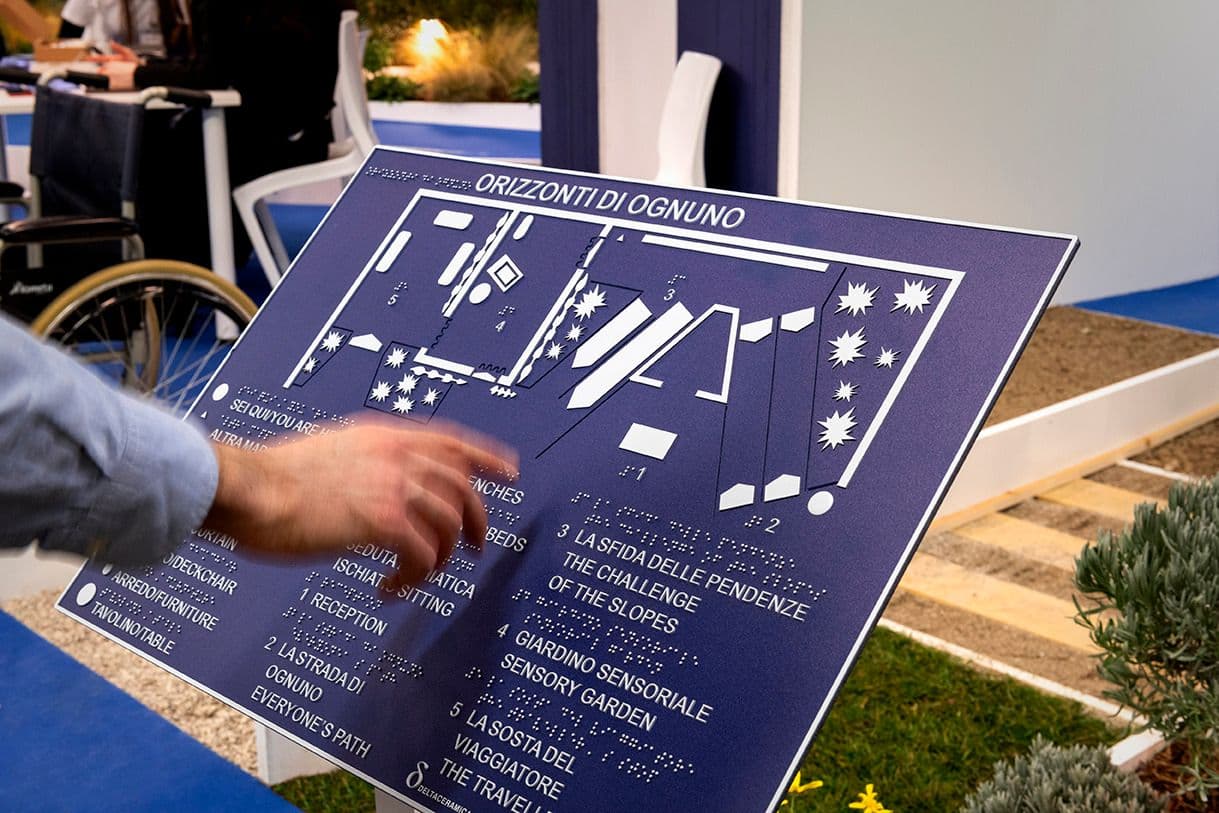 Un percorso esperienziale a tappe simula gli spazi dell’accoglienza outdoor e ne affronta le sfide proponendo soluzioni modulari e fruibili, secondo le best practice di Universal Design.