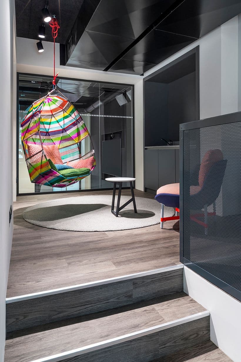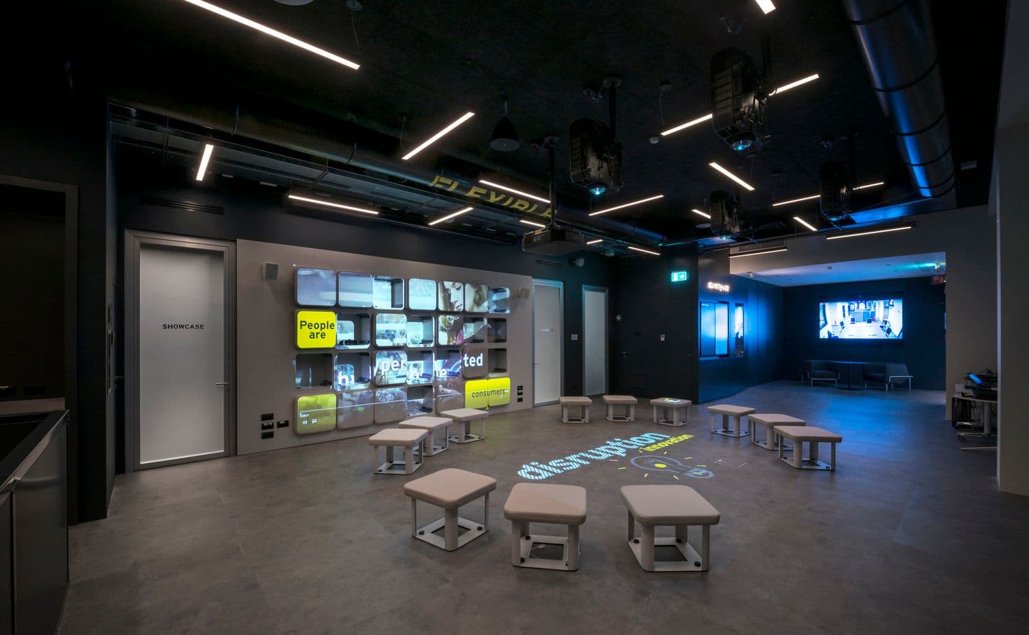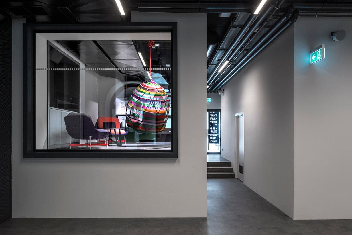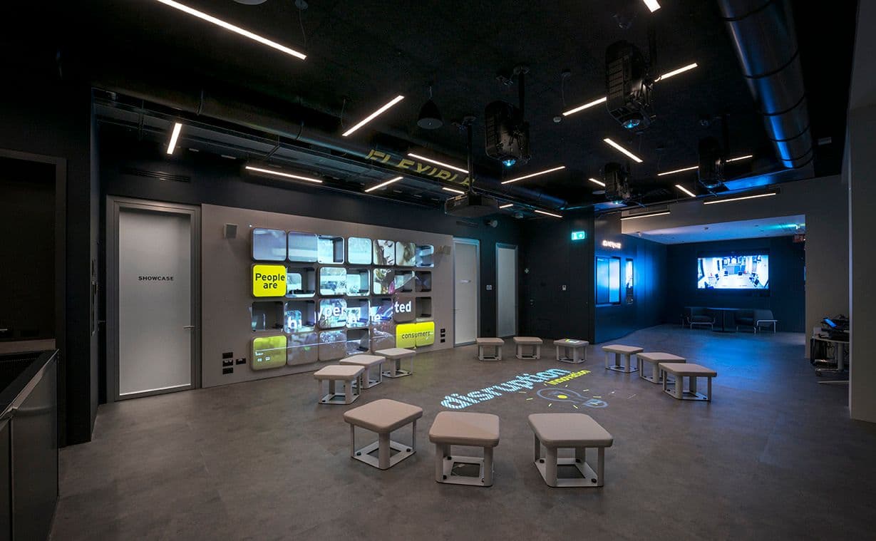 La reception del centro presenta cubi bianchi ispirati ai pixel, per introdurre l’utente in un’atmosfera suggestiva. L’area dedicata al teatro presenta degli schermi rotanti, mentre l’area demo presenta pannelli acustici speciali ed è progettata con installazioni esposte che consentono di esplorare le tecnologie del centro.