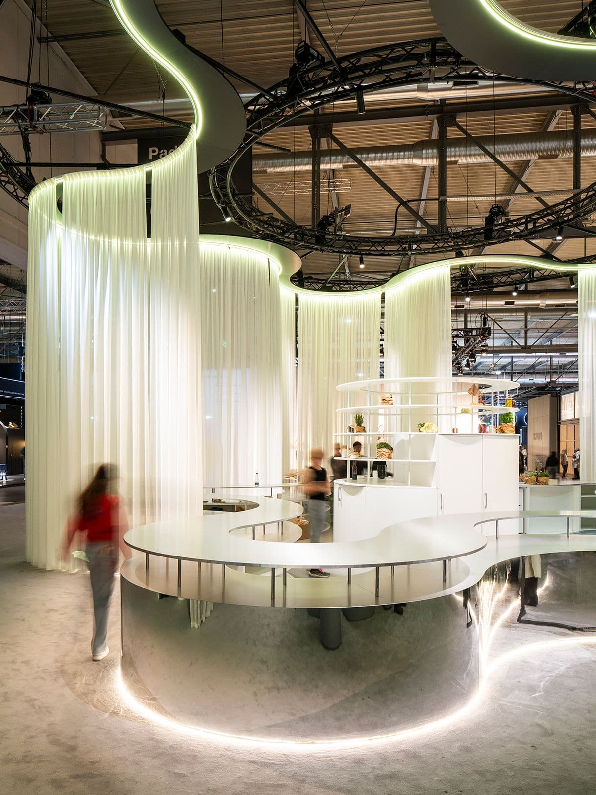 Un grande muro mette in relazione l’area dedicata all’esposizione di magazine e quella per le performance di chef, designer e artisti. Tende mobili e luce variabile permettono di riconfigurare la scena, rendendo l’intero ambiente una tela bianca pronta a colorarsi di identità diverse in tutta rapidità.
