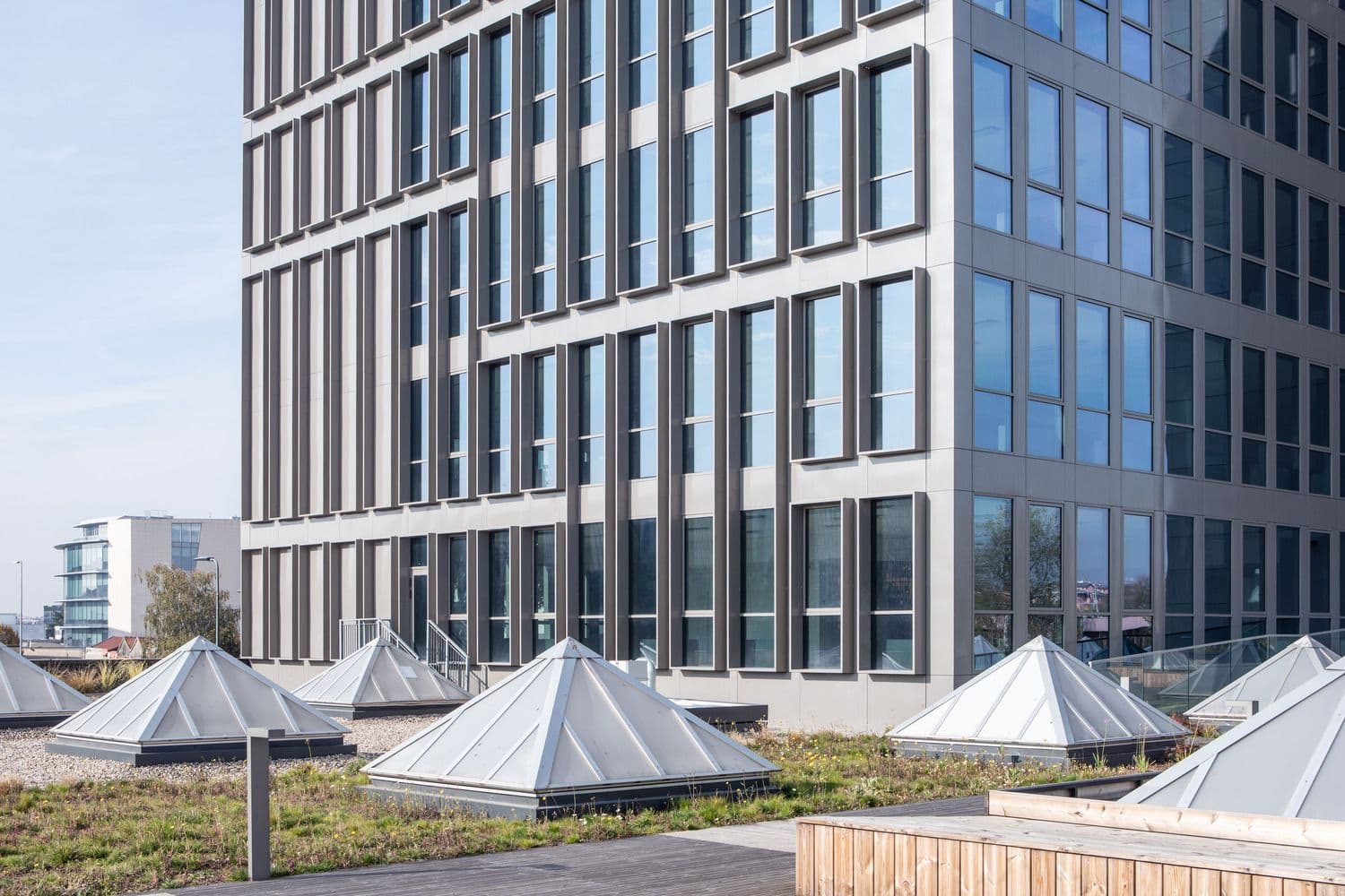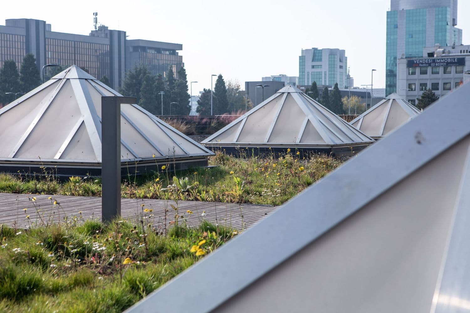La facciata metallica a doppio colore e i tagli luminosi, uniti al giardino sospeso e alla terrazza verde, posizionano l’edificio come landmark di efficienza e design.