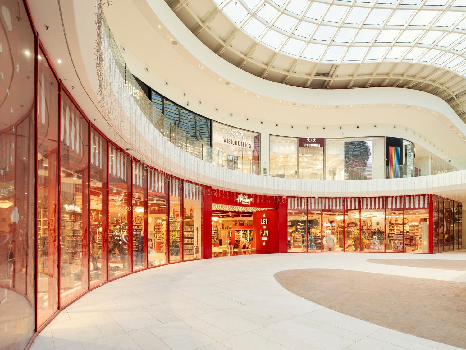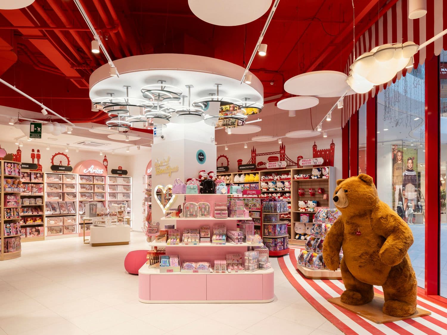 Il format italiano di Hamleys è stato sviluppato per garantire continuità e riconoscibilità, pur valorizzando le specificità dei contesti. A Milano, in corso Vittorio Emanuele, lo store su due livelli si organizza attorno alla scala monumentale BBPR, assunta come fulcro scenografico e spaziale. La scala definisce una piazza interna in cui convivono l’autobus rosso Hamleys e il tram milanese, mentre il portale d’ingresso richiama gli archi del Duomo e gli ascensori personalizzati accolgono il visitatore con il saluto “ciao Milano”. A Roma, nella Galleria Alberto Sordi, il progetto valorizza il carattere monumentale dello spazio storico. Il grande ingresso ad arco oro e rosso introduce a un ambiente concepito come piazza italiana, in cui il mosaico vincolato, i soffitti dorati, il lampadario custom e l’ascensore panoramico contribuiscono a costruire un’esperienza immersiva, arricchita da grafiche dedicate alla città. A Orio al Serio il format si adatta al contesto del centro commerciale, enfatizzando l’esperienza analogica del gioco. Il port luminoso, la giostra con cavalli e le aree demo diventano dispositivi di interazione e scoperta. A Pompei, nel Maximall, il dialogo con il territorio si esprime attraverso un portale metallico, un soffitto ispirato al tendone da circo e una facciata vetrata semicircolare che accoglie il visitatore con la scritta “Hello Pompei” e grafiche dedicate ai monumenti locali.