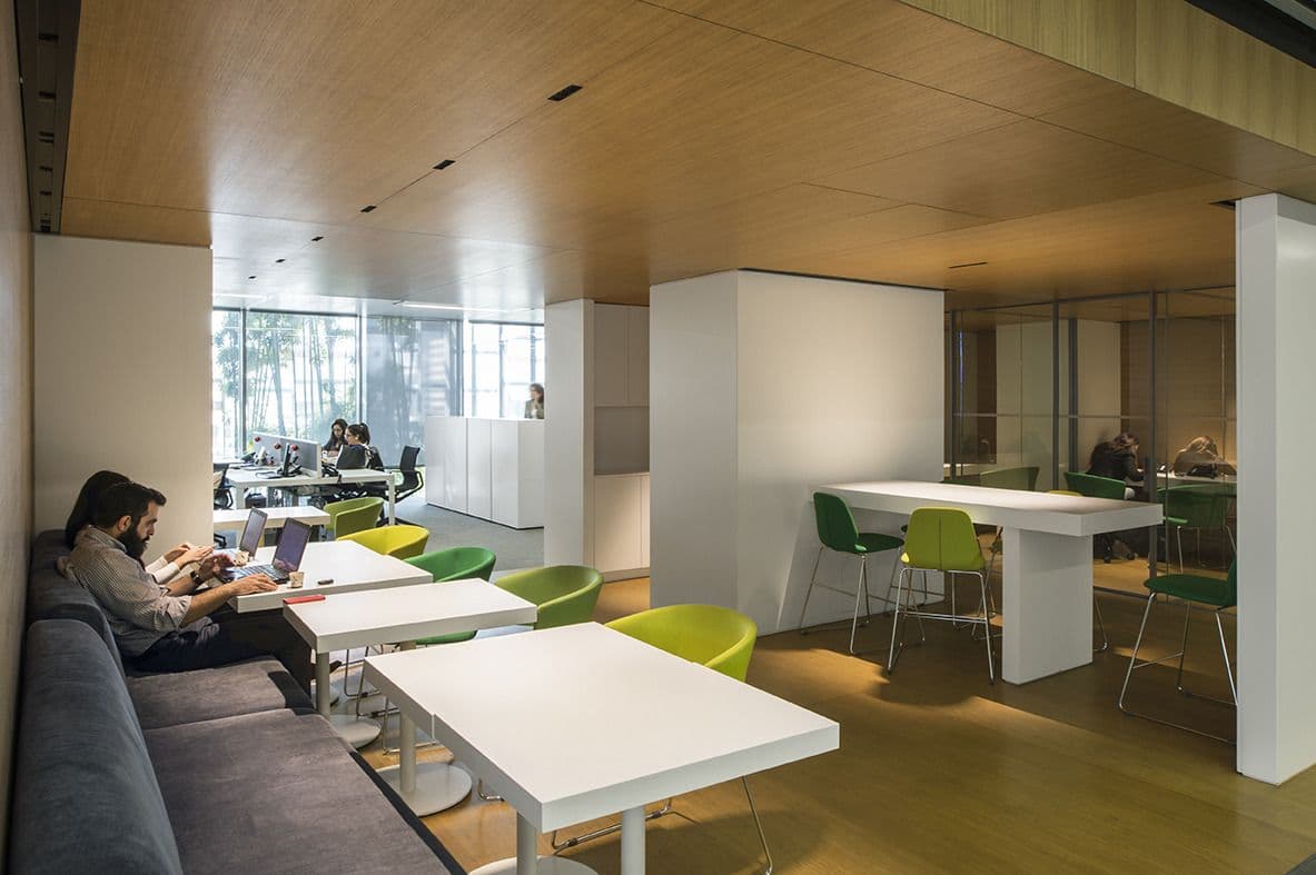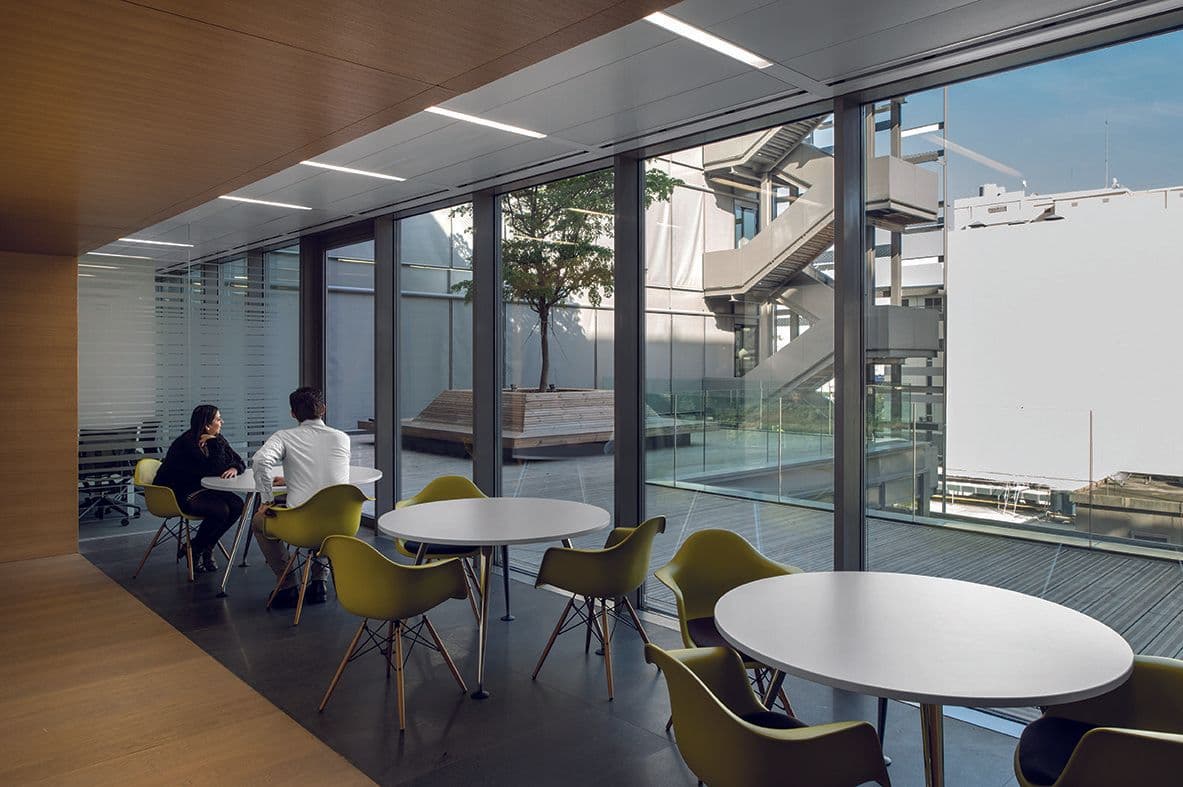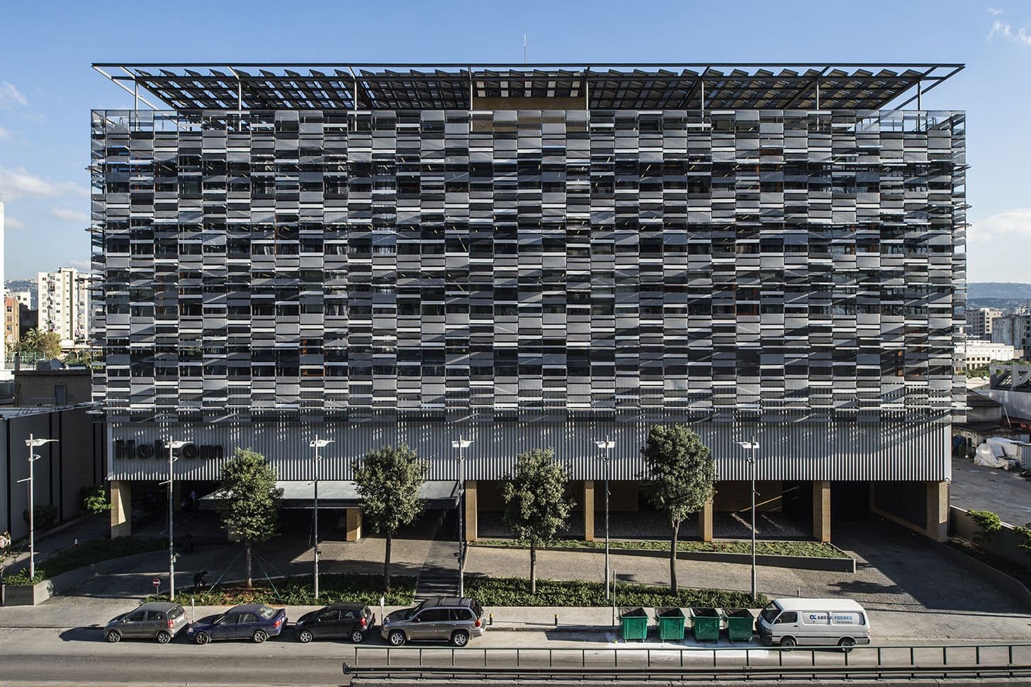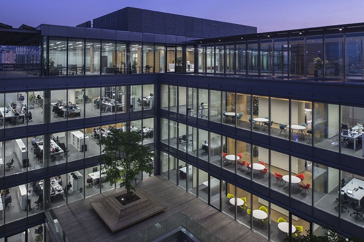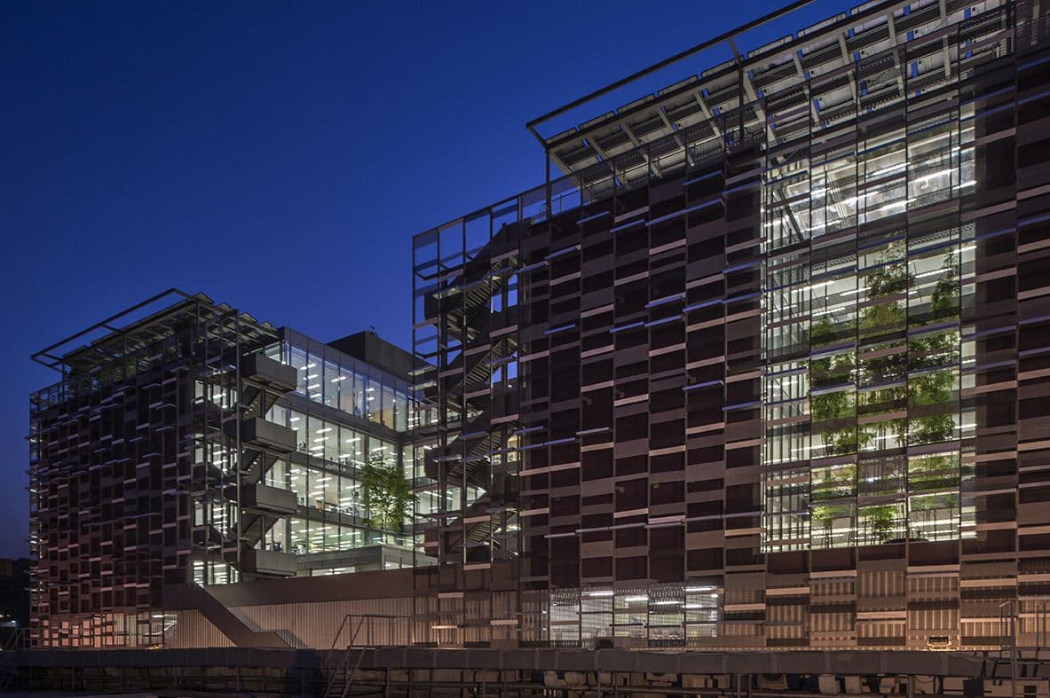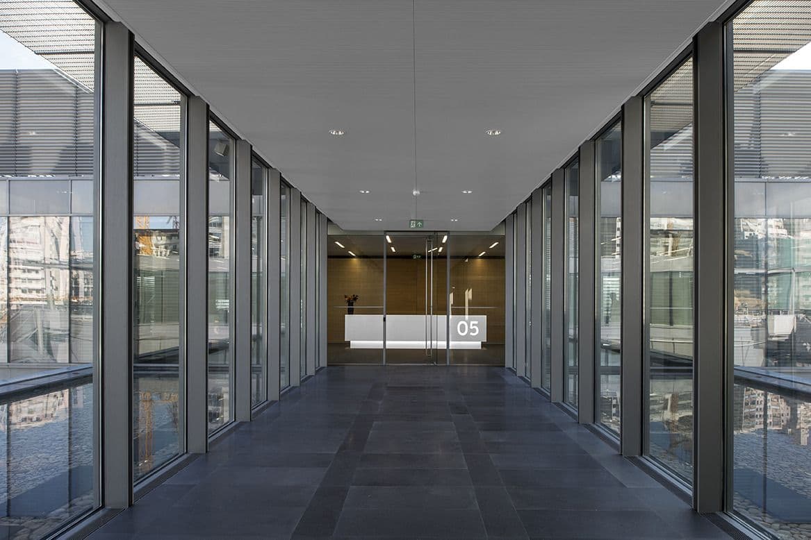 L’architettura è definita da una doppia pelle che tiene insieme immagine e prestazioni. Il primo strato è una curtain wall vetrata continua, arretrata di 20 cm oltre il bordo solaio per consentire l’inserimento della fascia di coibentazione termica e acustica; il secondo è una schermatura esterna in griglia metallica con elementi cromati aggregati in moduli eterogenei, capace di generare un pattern dinamico che alleggerisce la massa e restituisce unità al volume. All’interno, un modulo di 1,5 m ordina facciata, pavimento sopraelevato e controsoffitto a telaio multifunzionale, predisposto per partizioni vetrate, corpi illuminanti, tende, aerazione e barriere acustiche riposizionabili. Patii e pozzi di luce migliorano l’illuminazione naturale e articolano i flussi pubblici e privati. Il verde completa il sistema con chiostri, terrazze alberate, un bosco di agrumi di 500 mq e un muro vegetale nella lobby.