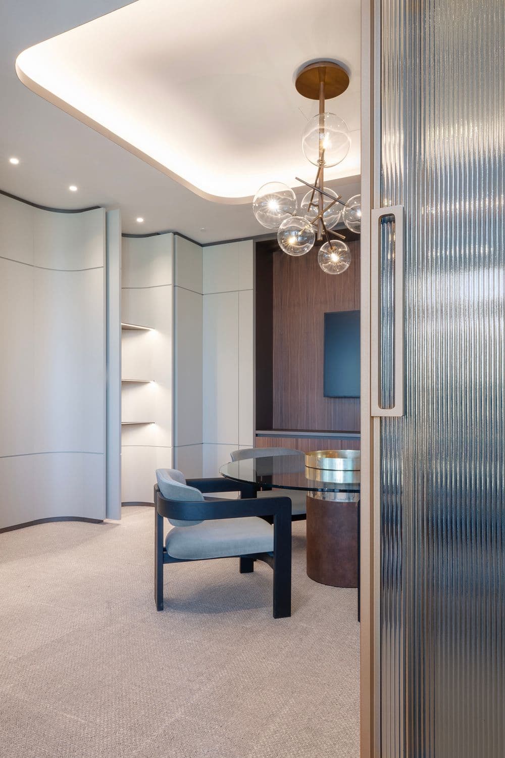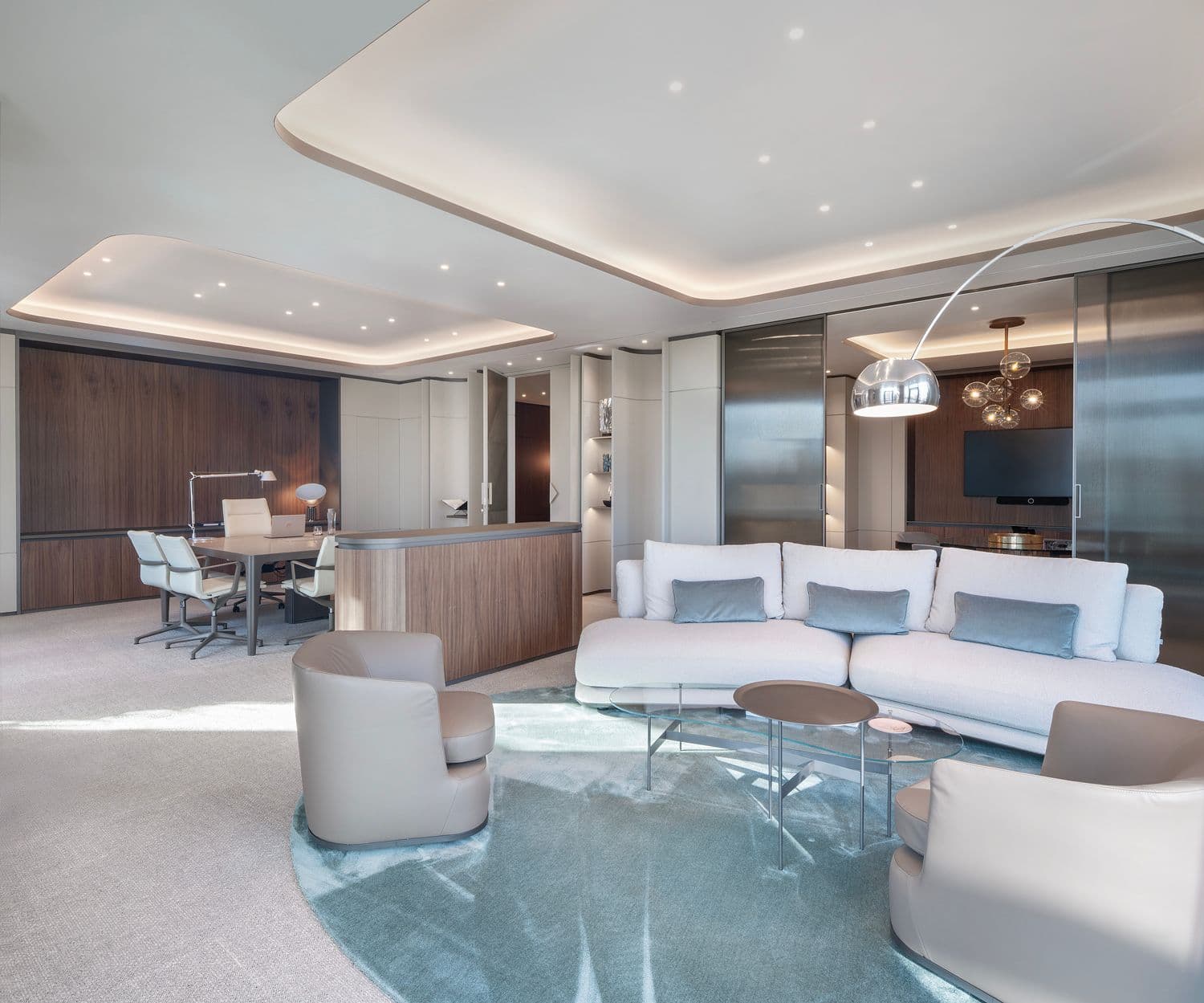 La coerenza del progetto si riflette anche negli spazi direzionali, sintesi perfetta di interior design e prestigio. L’impiego di materiali nobili come la boiserie in noce americano si fonde con arredi custom-made e pezzi iconici di B&B Italia e Gallotti&Radice, creando un’atmosfera di sobria ed elegante autorevolezza.