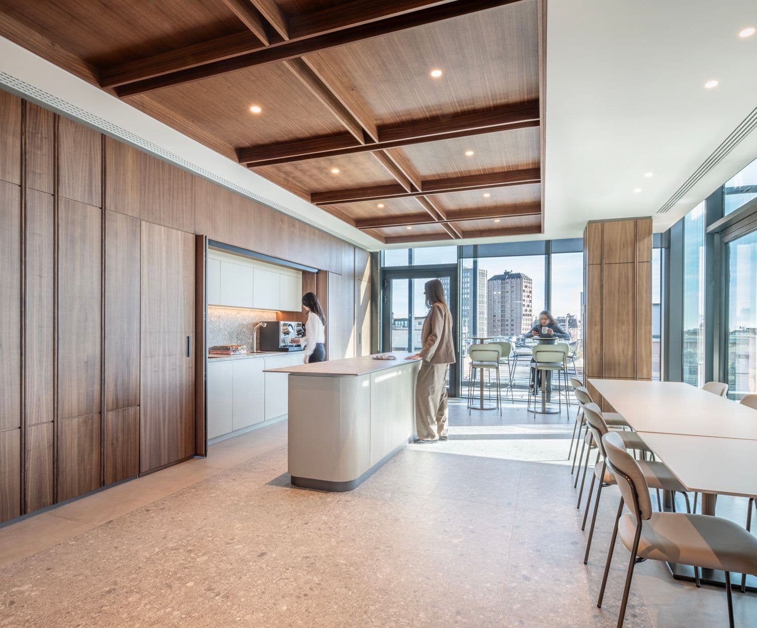 L'anima versatile del progetto emerge nell'area break: uno spazio polivalente con cucina a scomparsa e terrazzo integrato, ideale per eventi e networking.