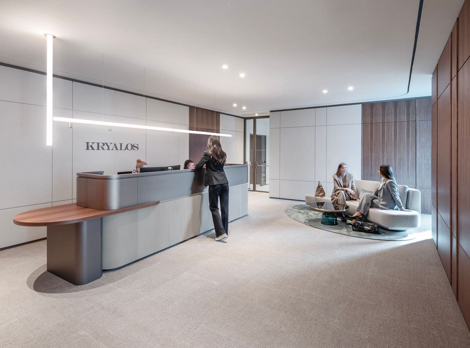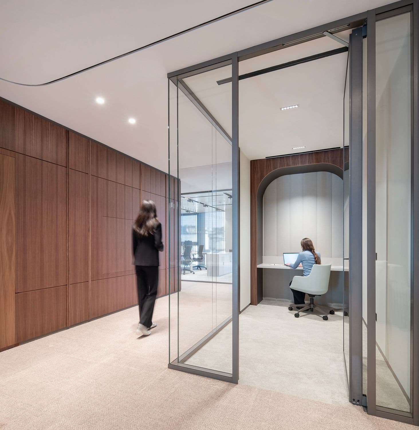 Sviluppati sugli ultimi tre piani dell’Edificio A, gli uffici offrono ambienti accoglienti ispirati all’hôtellerie di lusso. Se gli spazi operativi sono concepiti come uffici chiusi per garantire la massima privacy, le aree dedicate ai clienti si aprono in reception, boardroom e sale meeting di alta rappresentanza.