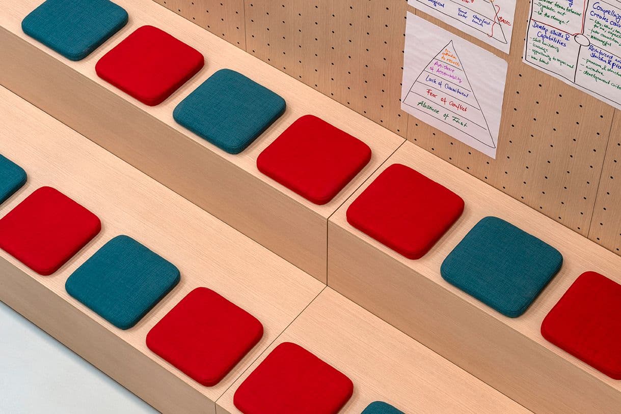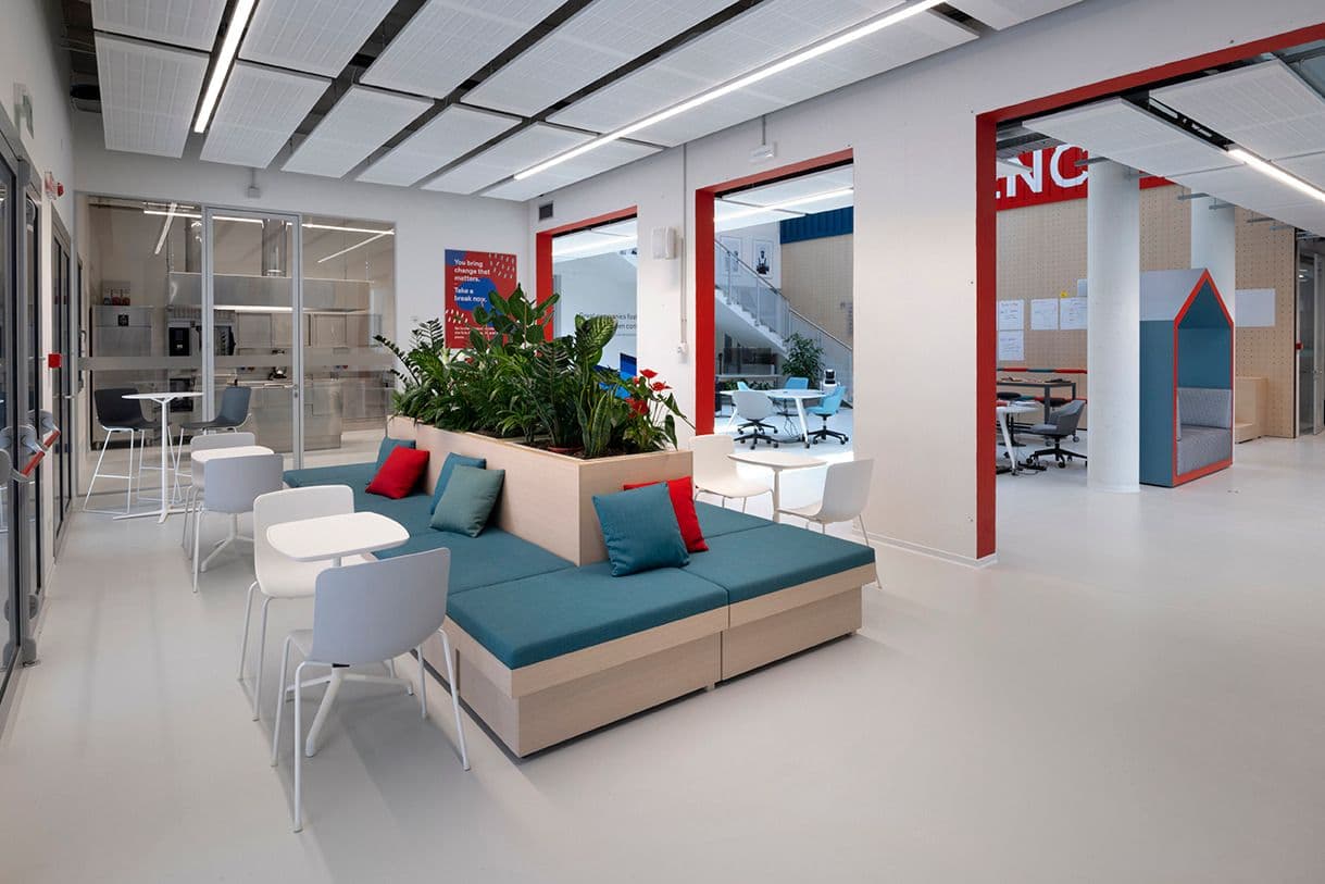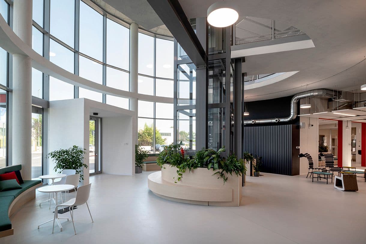 Lo stile “urban” connota la reception e l’area warm-up, pensata per eventi e sessioni di training, mentre lo stile “factory” caratterizza il creative garden pensato per facilitare la creatività e la socializzazione, e lo stile “new retro” è dedicato agli ambienti operativi del primo piano di cui rispecchia la maggiore formalità.