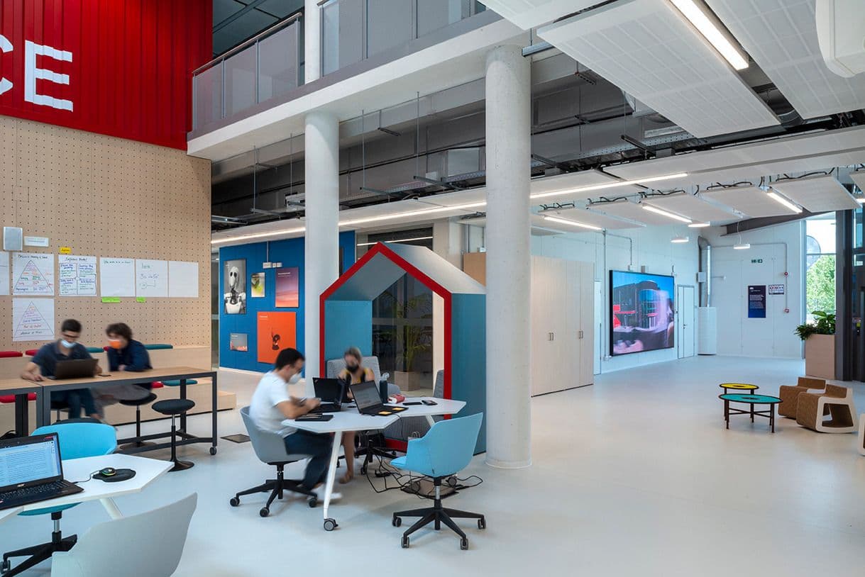 La disposizione degli spazi è pensata per garantire la massima flessibilità tra aule formative modulari, postazioni di lavoro, meeting room e zone espositive.