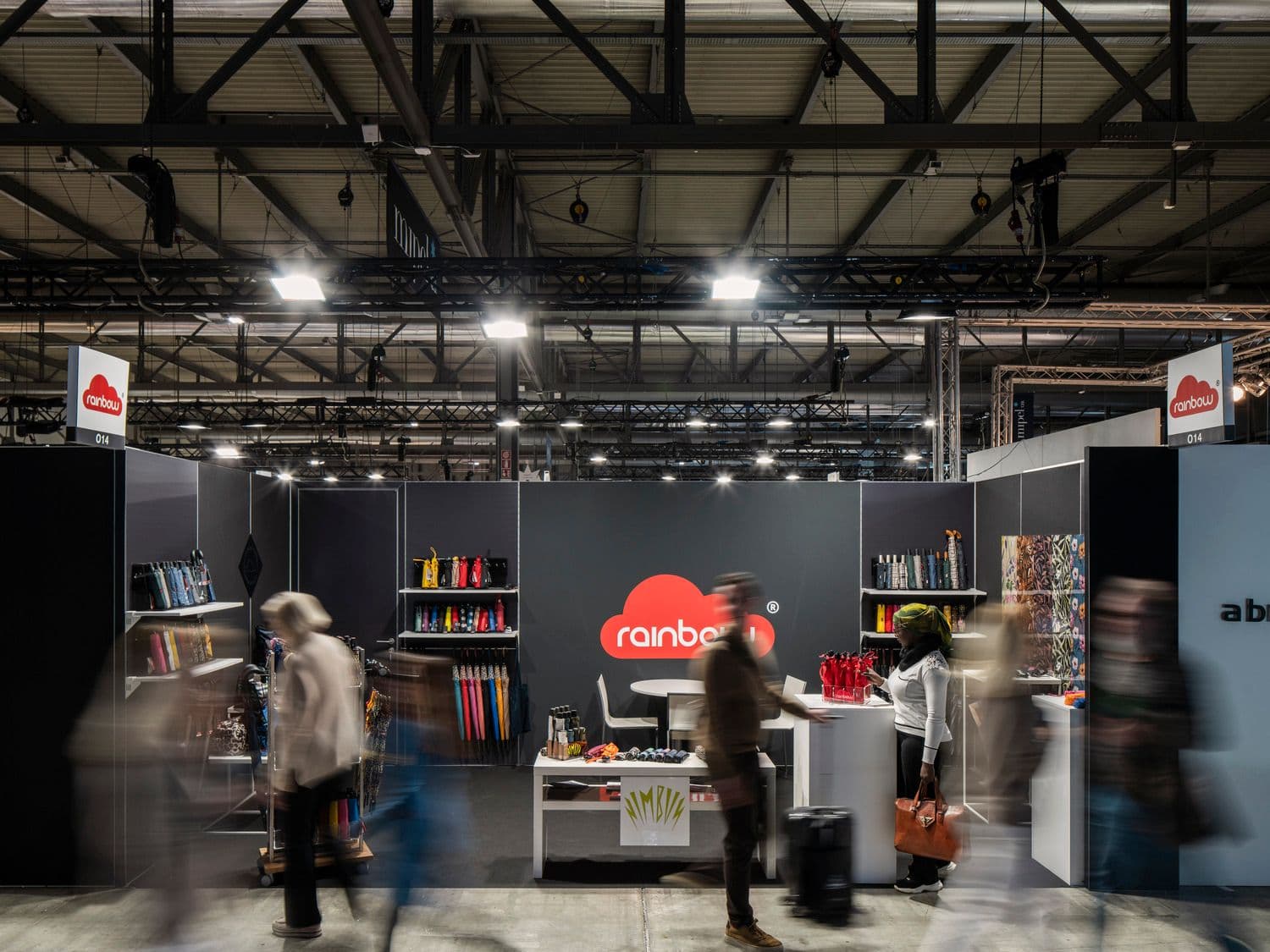 La luce generale viene abbassata per far emergere gli stand e rendere più chiaro l’orientamento. La piazza centrale concentra funzioni comuni e costruisce un punto di contatto diretto tra MIPEL e MICAM.