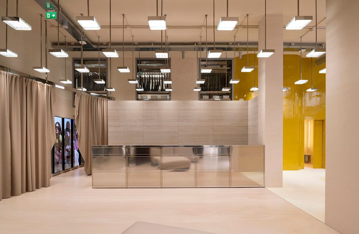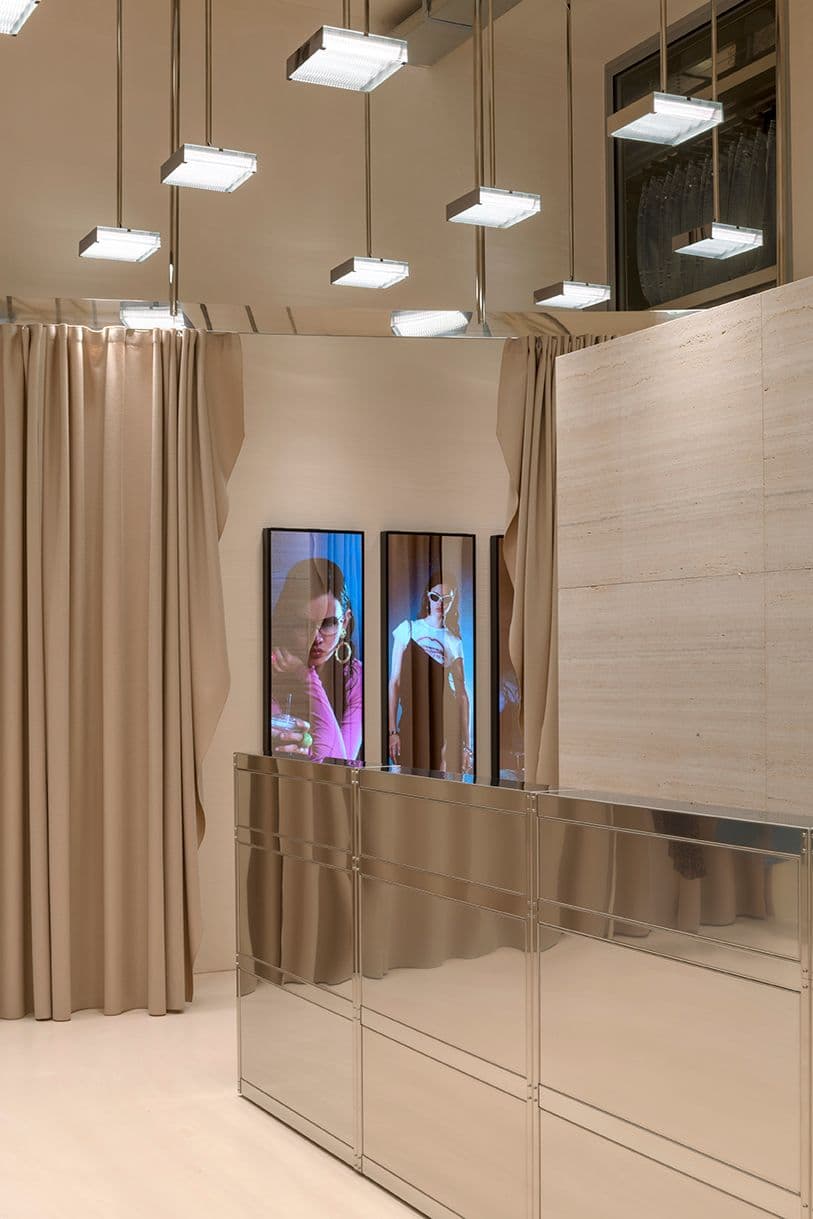 Per lo store sono stati impiegati materiali come inox, resina e travertino che definiscono un ambiente contemporaneo adatto anche a eventi e sfilate.