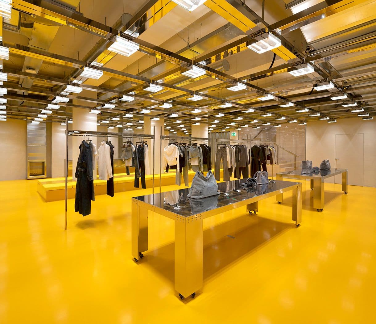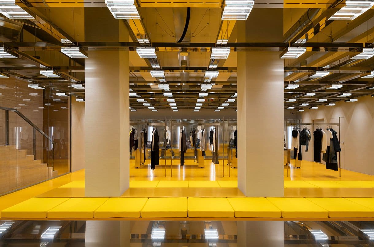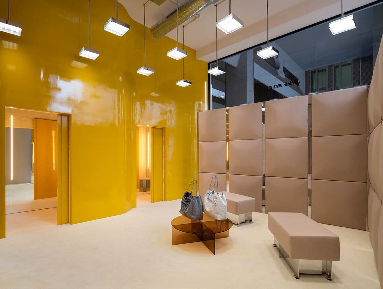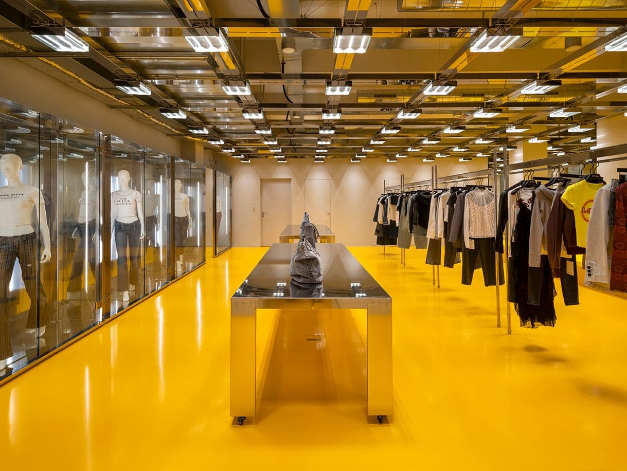 Il layout dello store presenta una struttura flessibile, adatta a molteplici usi grazie all’ottimizzazione dei percorsi. All’interno, la grande scala in travertino è protagonista del piano inferiore, accompagnata dal pavimento in resina epossidica e da altri dettagli gialli che richiamano il colore caratteristico di Miss Sixty.