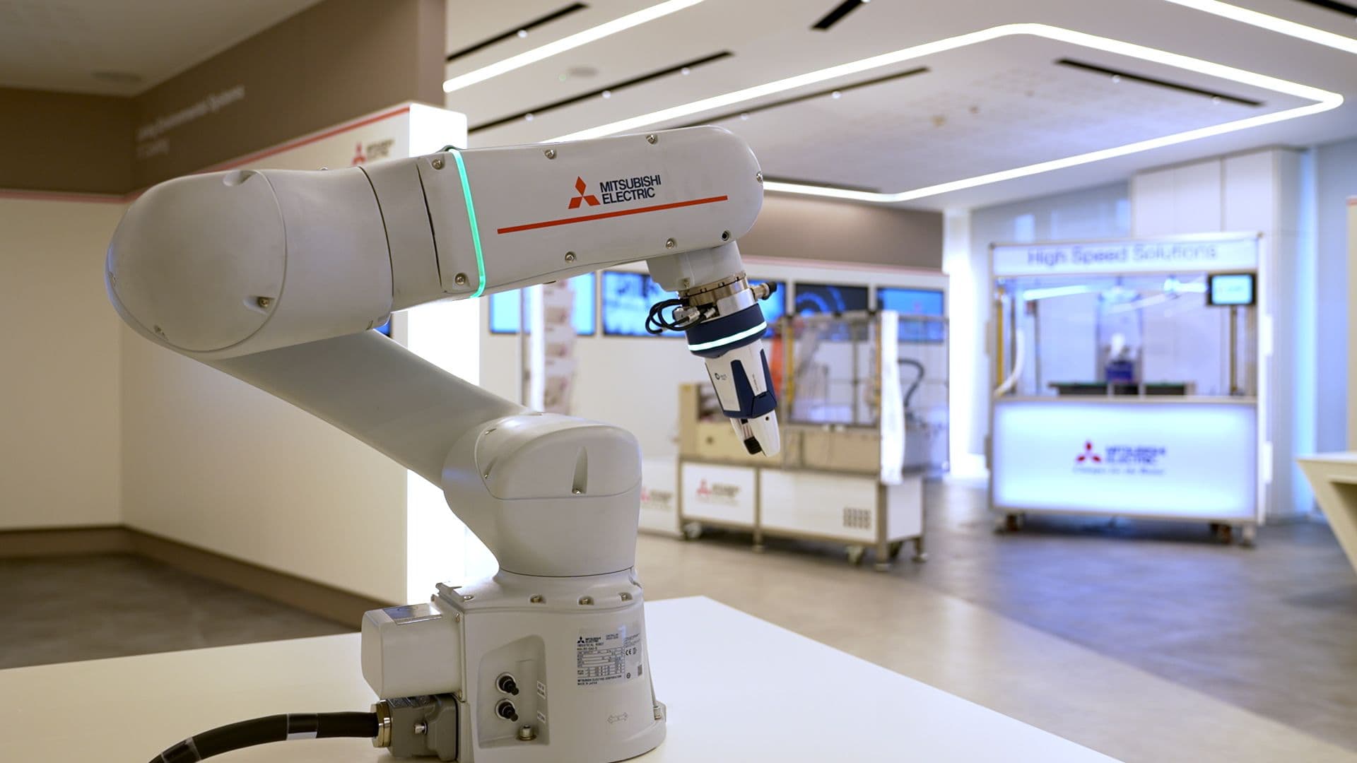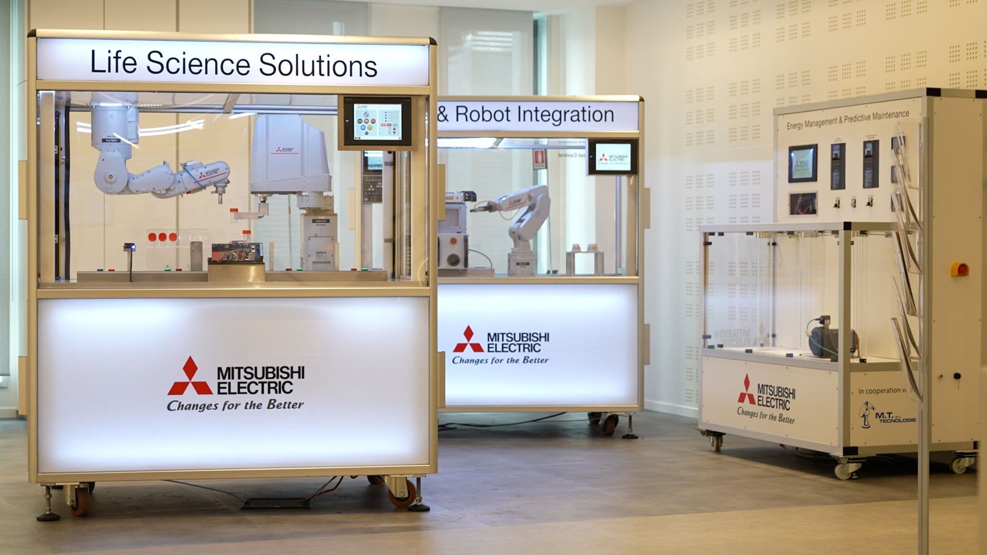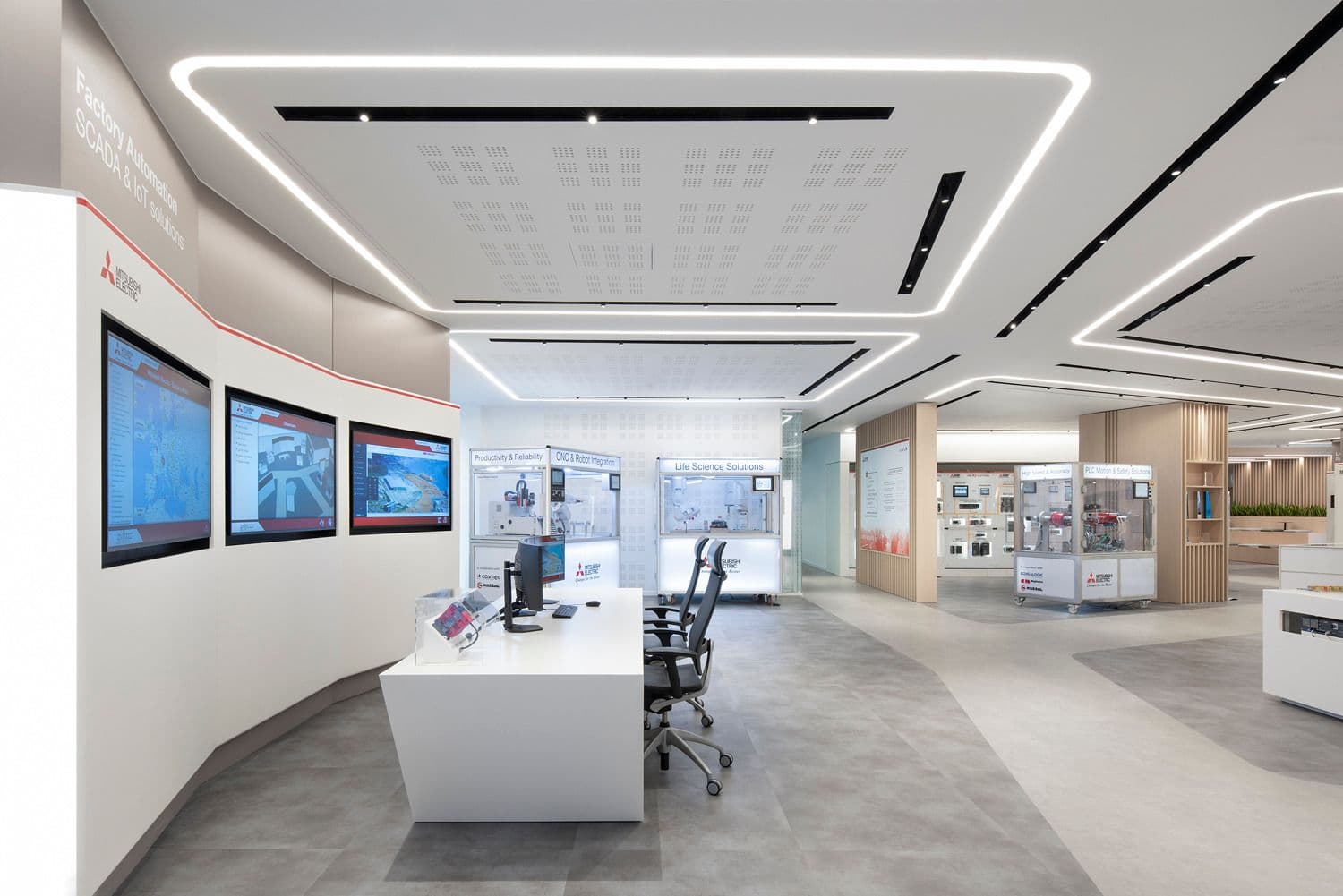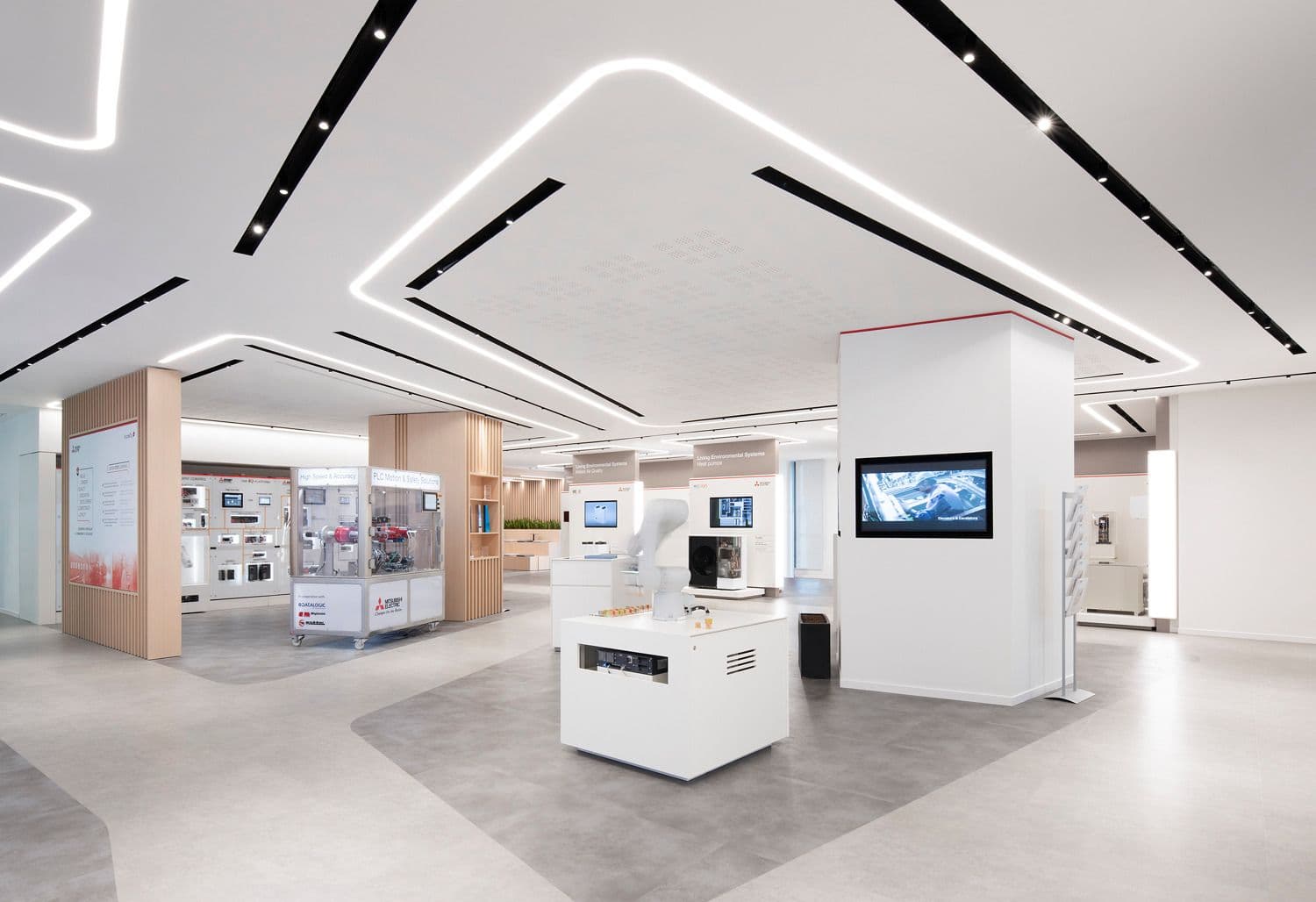 Al piano terra, un grande showroom introduce l’esperienza Mitsubishi Electric, con un portale multimediale e aree espositive interattive dedicate ai principali settori dell’azienda. Gli spazi interni privilegiano l’open space per il lavoro dinamico, affiancati da aree di supporto e ambienti flessibili. I laboratori e le training room, con oltre 80 postazioni, sono pensati per aggiornamenti tecnici e workshop.