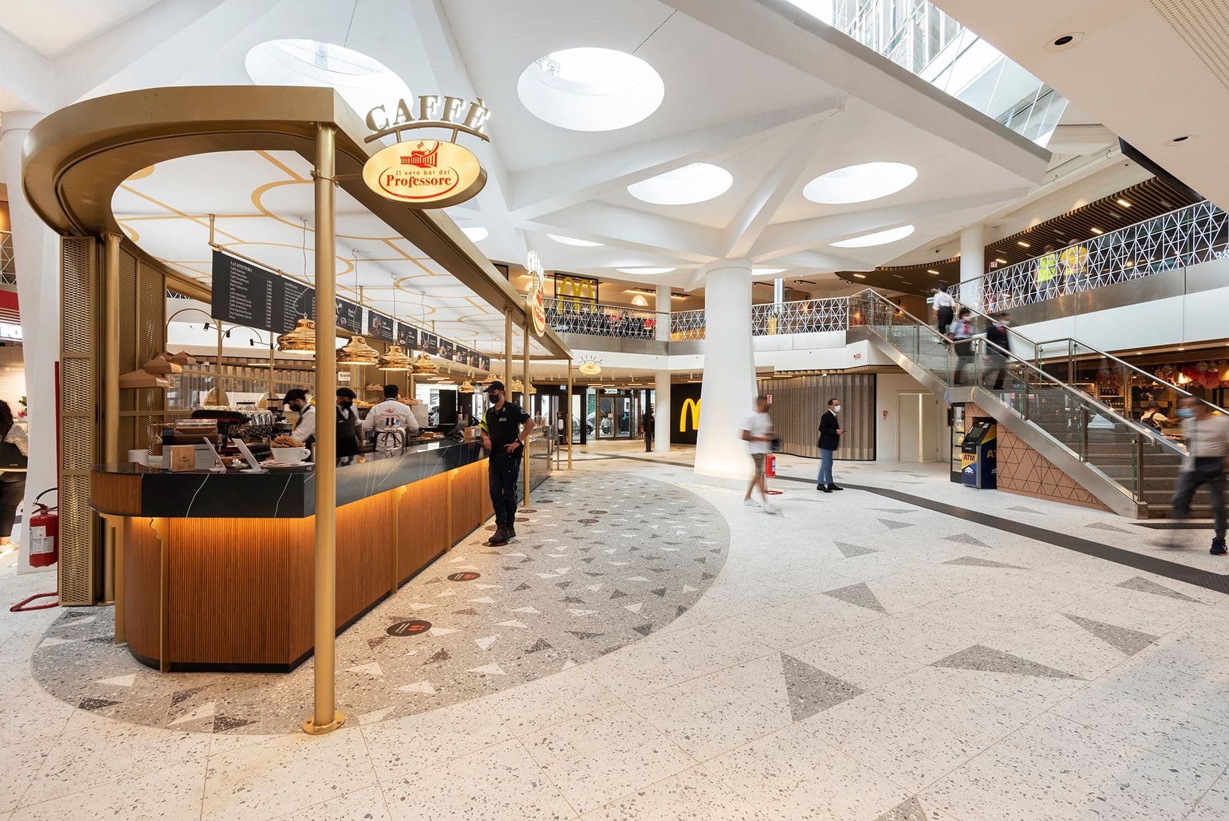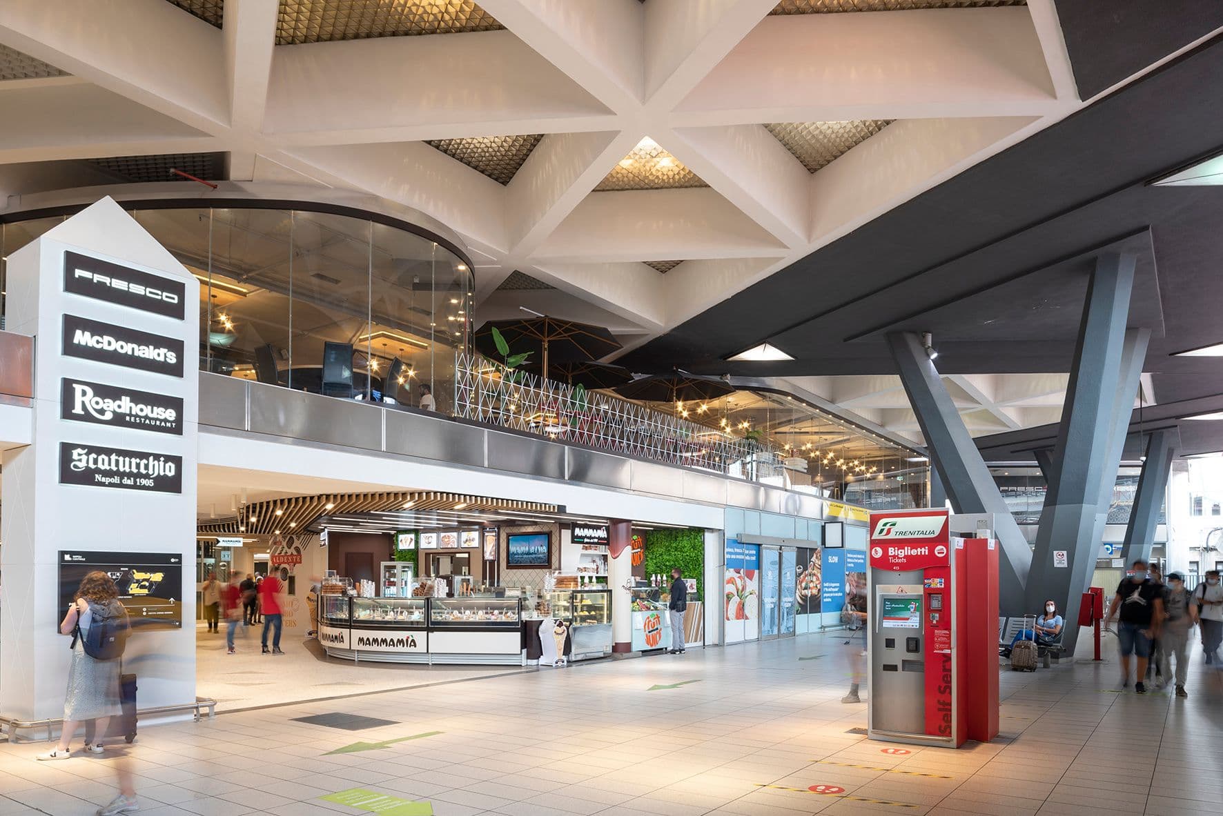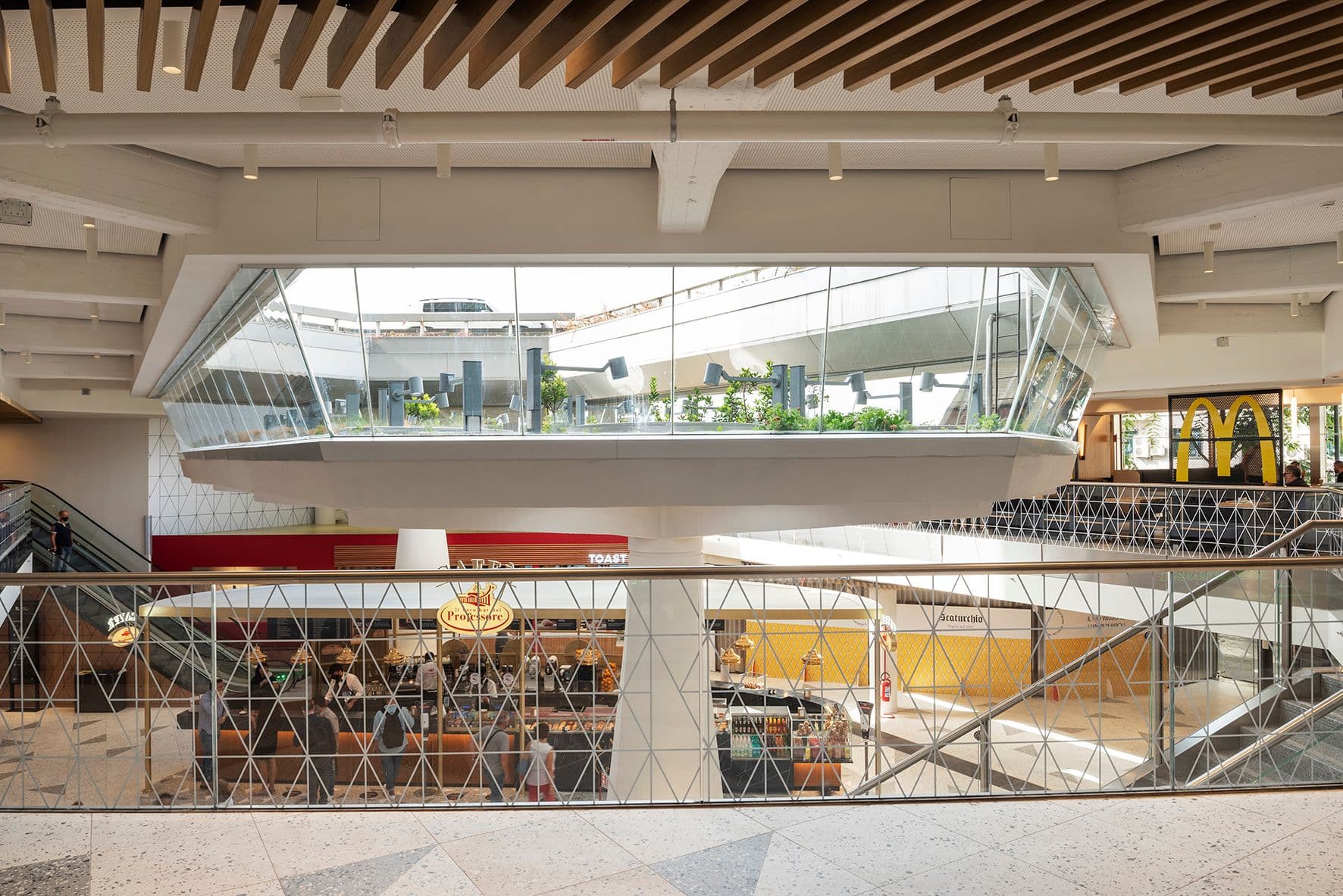 La Food Hall si sviluppa su tre livelli: piano interrato con magazzini e locali tecnici, piano terra di 2.100 mq e mezzanino Nord di 3.200 mq, collegati da nuove scale mobili. Il nucleo centrale è un grande vuoto a doppia altezza, illuminato dal lucernario esagonale, trasformato in giardino pensile che integra natura e luce naturale. Gli spazi di ristorazione veloce e slow convivono in open space definiti da linee fluide su pavimenti, controsoffitti e terrazze pensili. Sistemi acustici avanzati migliorano il comfort acustico, mentre facciate vetrate continue, nuovi fronti commerciali e branding su base triangolare garantiscono identità, visibilità e coerenza architettonica.