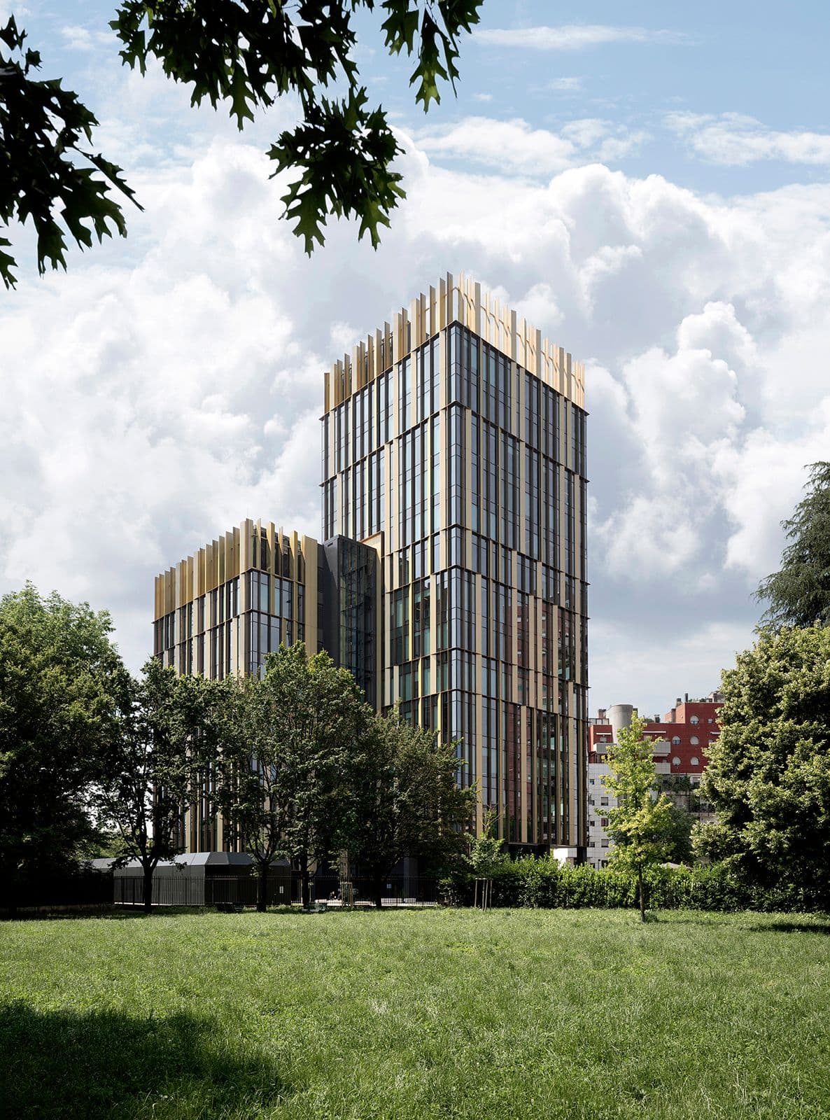 L’edificio si sviluppa su due torri di 8 e 14 piani, caratterizzate da una facciata in cui elementi metallici e vetrate creano un ritmo verticale. Gli spazi interni, flessibili e frazionabili, rispondono a diverse esigenze d’uso. Il progetto, conforme ai più alti standard ESG, ha ottenuto le certificazioni WELL Gold e LEED Platinum grazie a scelte sostenibili, quali: la raccolta e il riuso dell’acqua piovana, il riciclo dei materiali, l’uso di vetro low-carbon, l’installazione di pannelli fotovoltaici e di sensori per il monitoraggio della qualità dell’aria, la massimizzazione del comfort e dell’apporto di luce naturale.