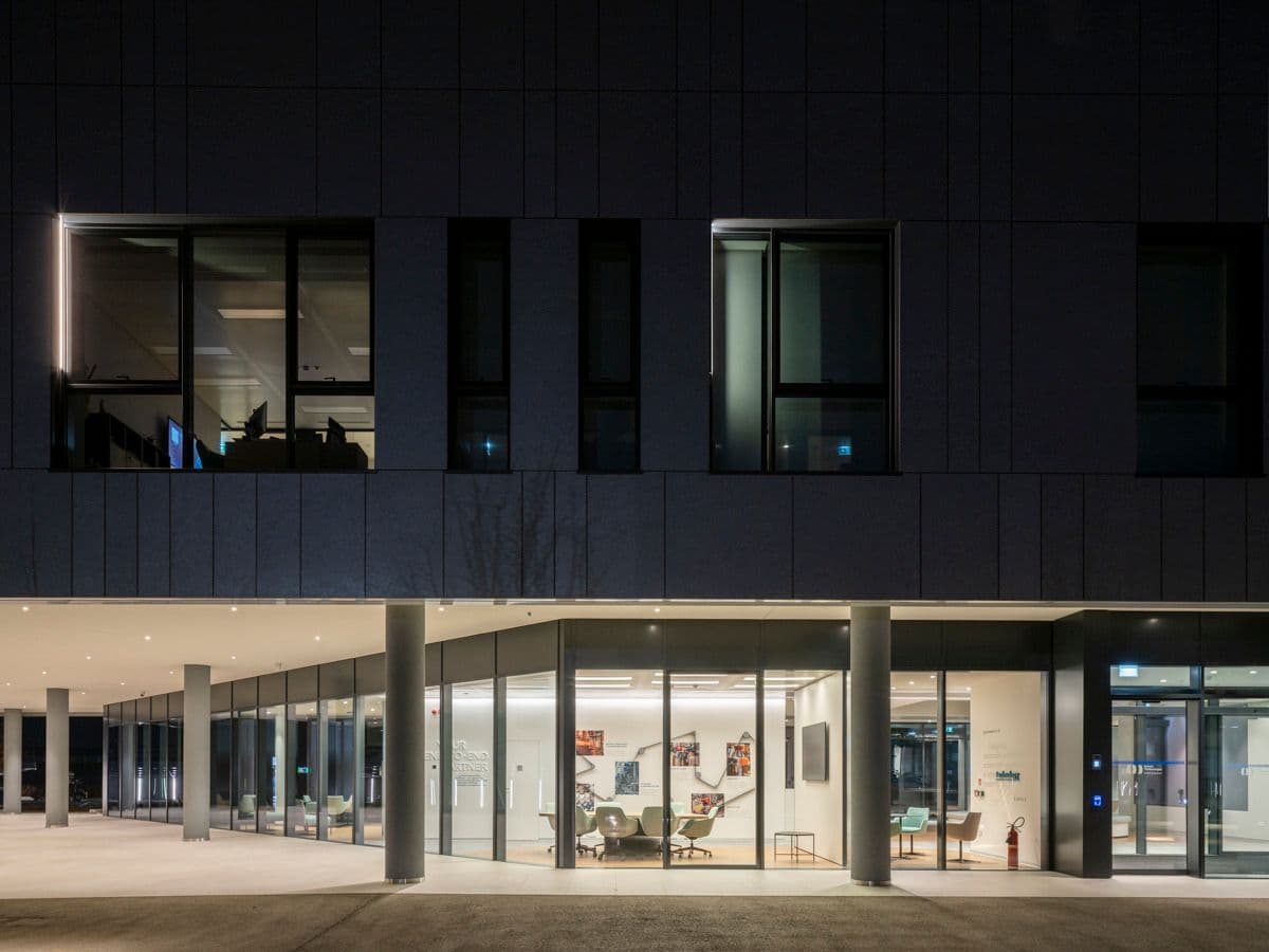 Il risultato è un “costruito sul costruito” capace di accogliere, oltre a nuovi spazi ufficio, una serie di funzioni e aree di supporto comuni, svettando tra i vigneti di Treviso.
