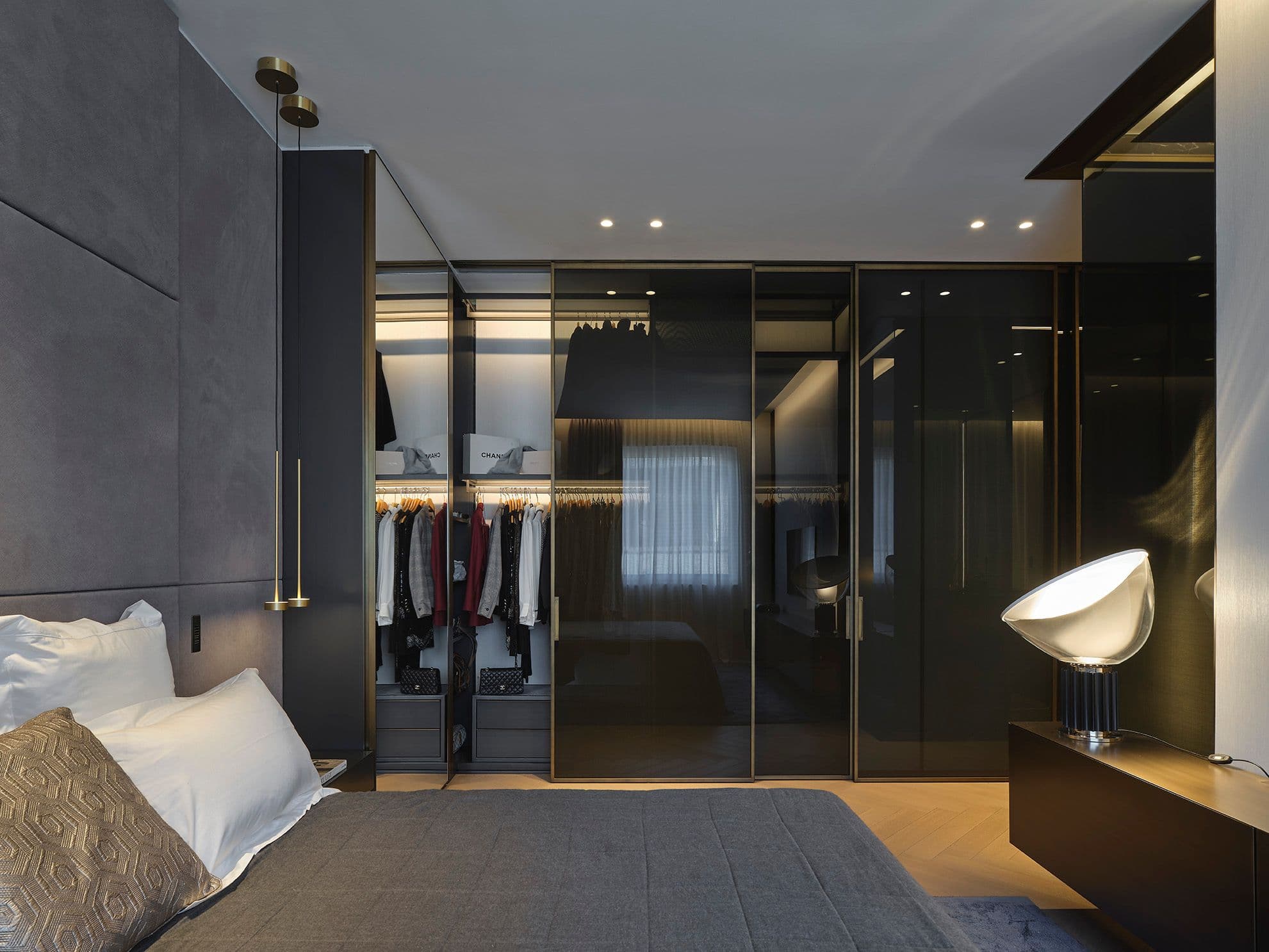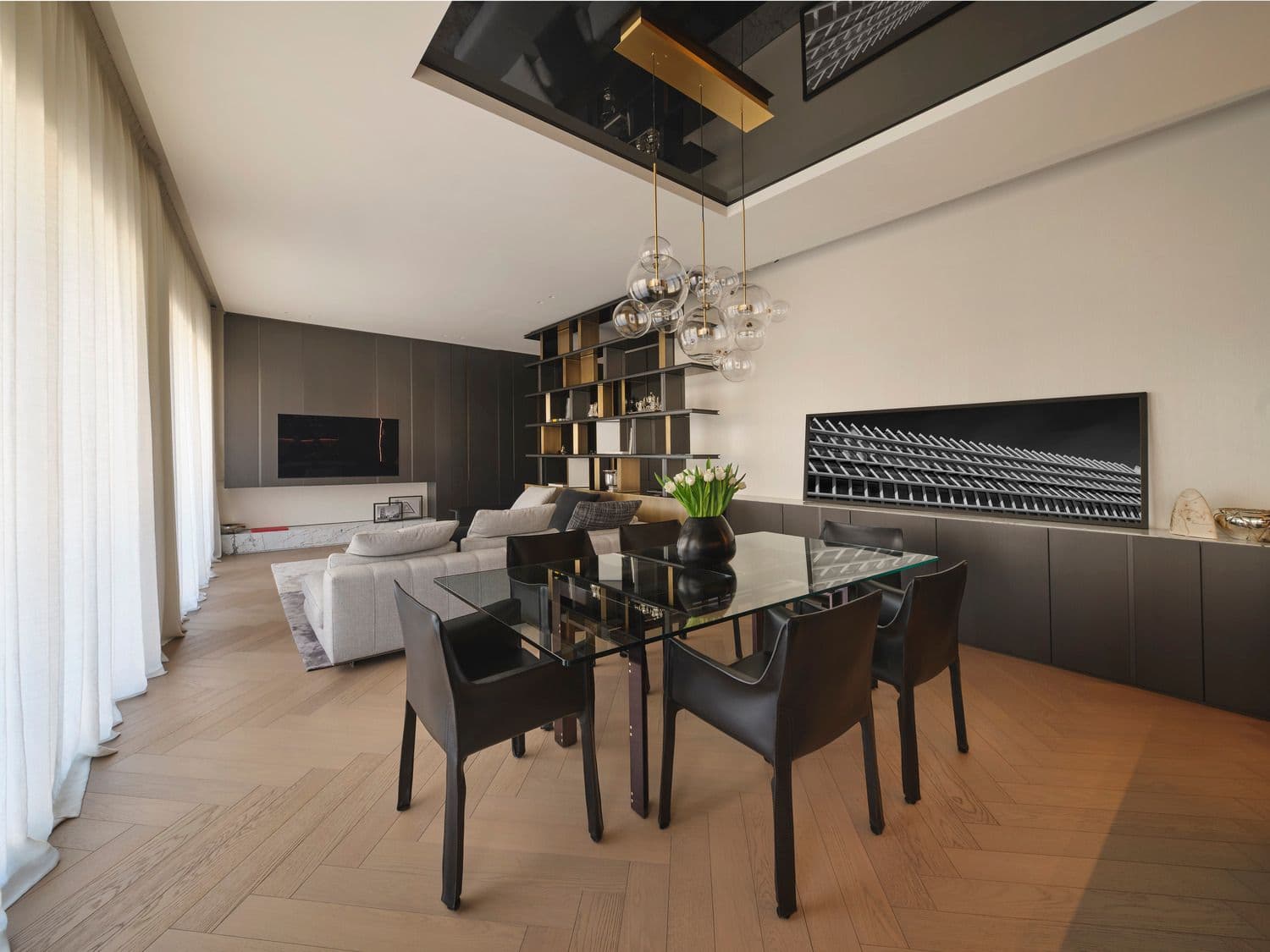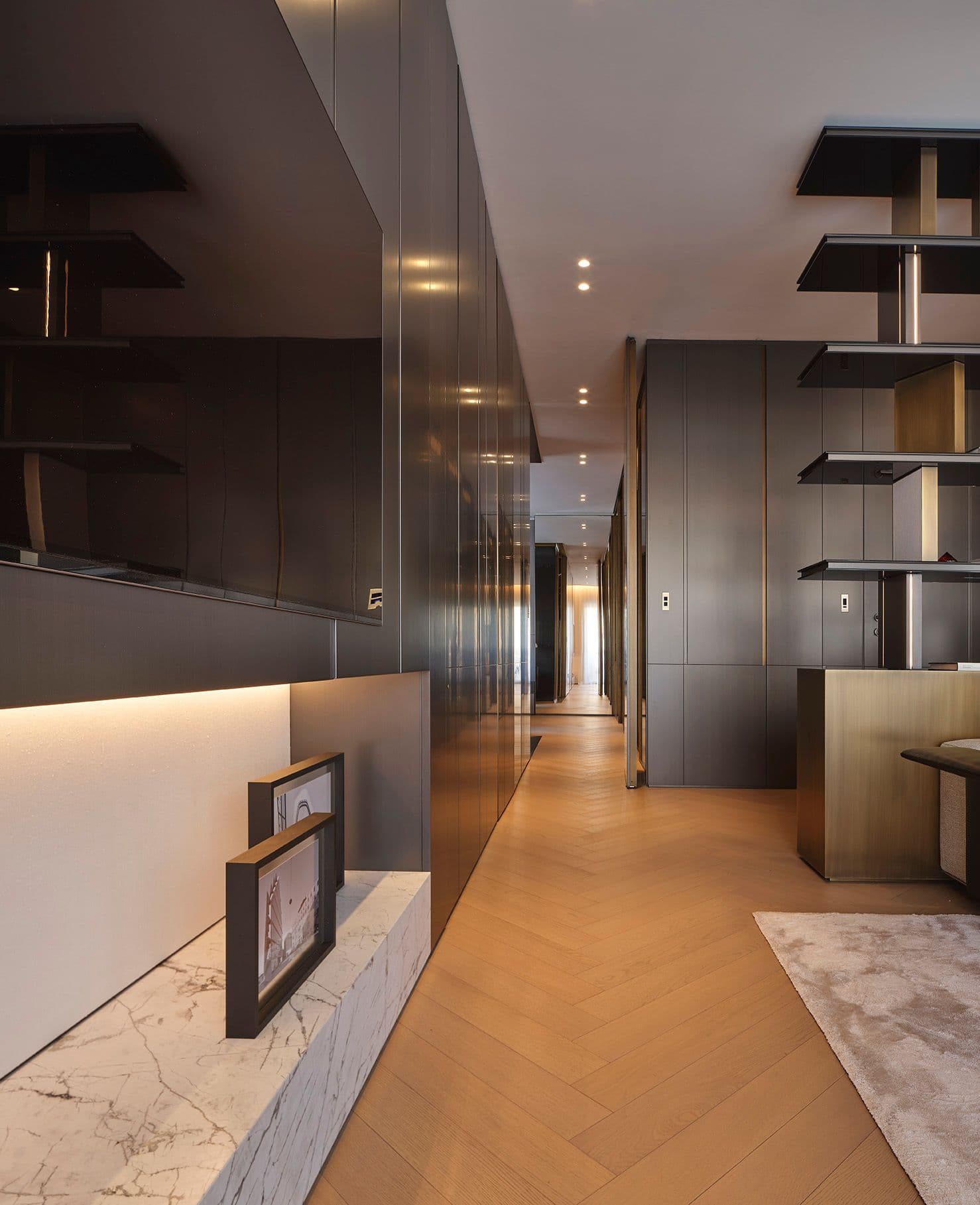 La residenza si sviluppa con un layout flessibile, privo di divisioni nette, dove living, cucina e zona notte si fondono grazie a soluzioni sartoriali e materiali pregiati. La scelta di arredi realizzati su misura, l’uso di vetri, marmi, ottone e boiserie in legno con finiture a base ferrosa creano un ambiente tridimensionale dalle sfumature petrolio. L’illuminazione, studiata per diffondere una luce discreta, rafforza l’atmosfera di benessere domestico. La spa privacy è raggiunta tramite una zona notte che si fonde con l’area bagno, delineando uno spazio pensato per la massima intimità e relax.