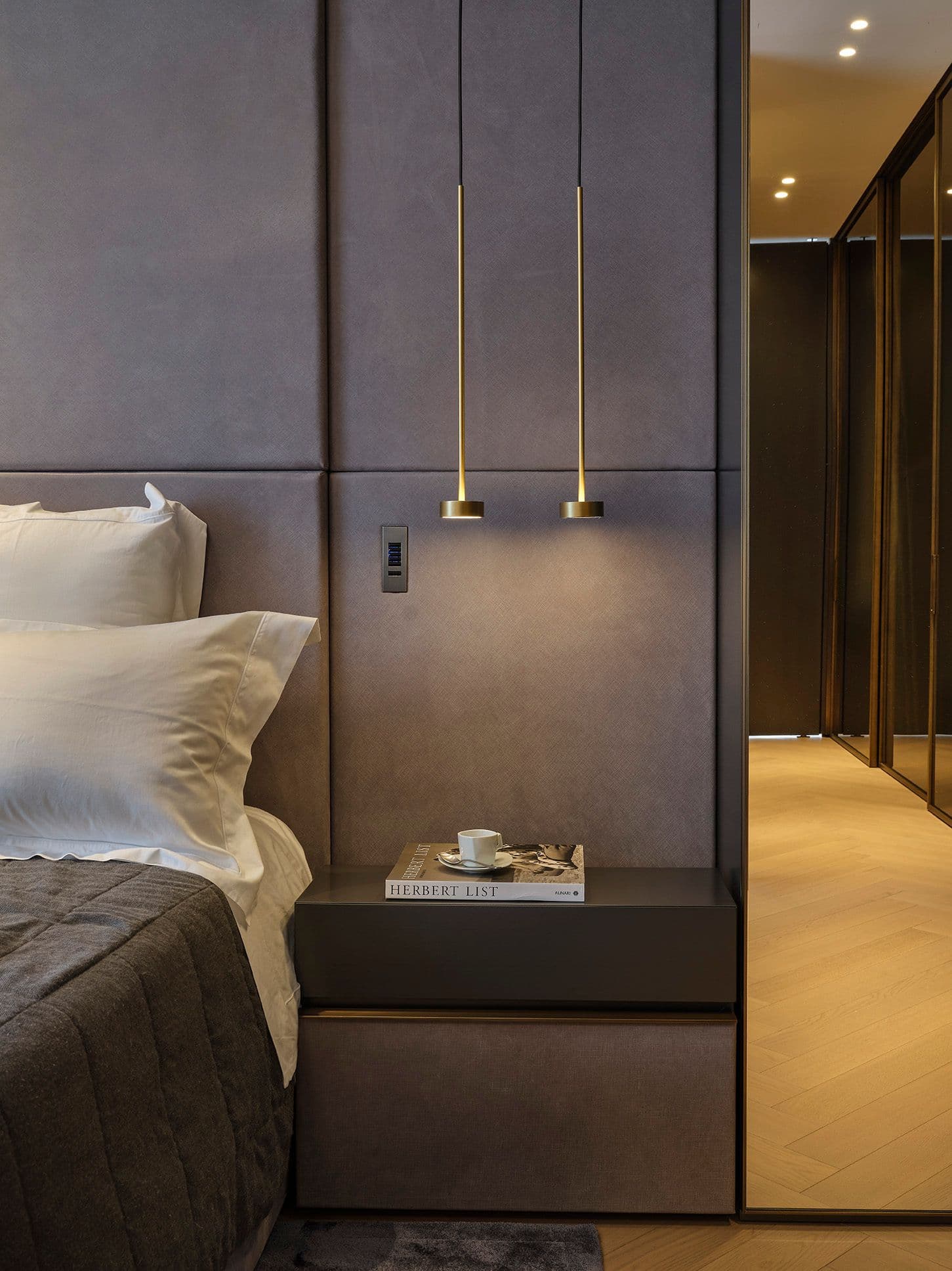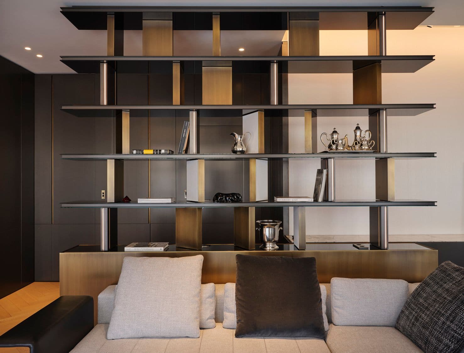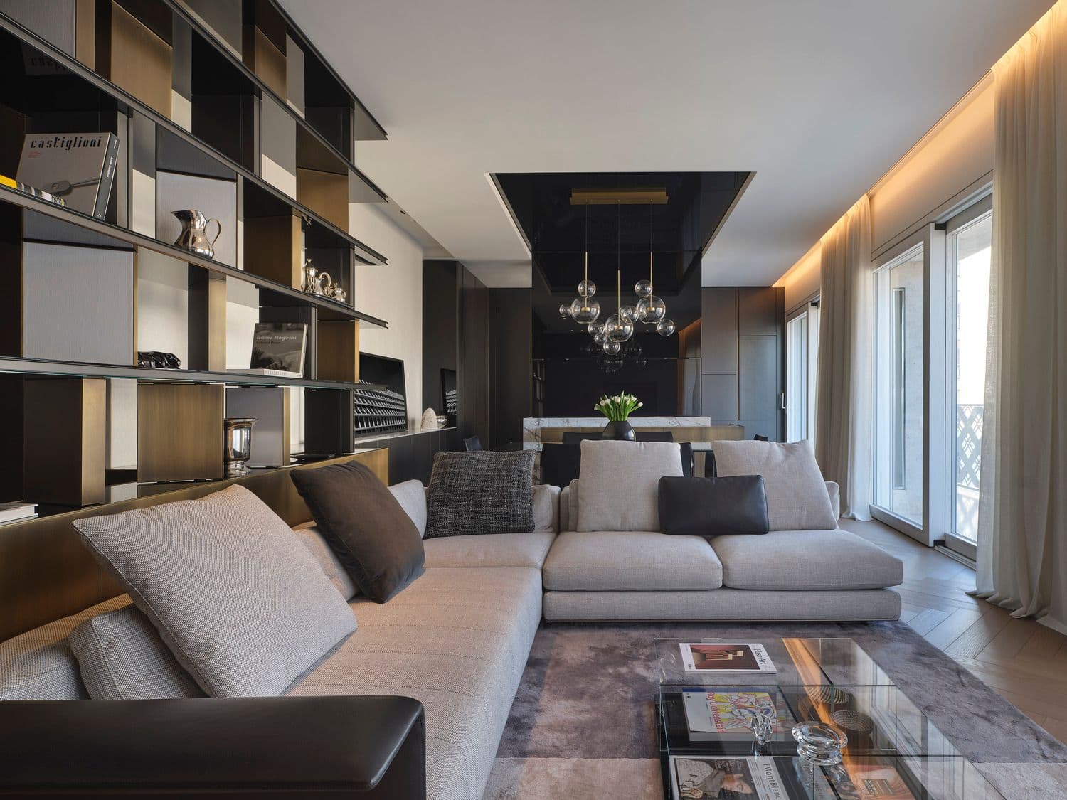 La residenza si sviluppa con un layout flessibile, privo di divisioni nette, dove living, cucina e zona notte si fondono grazie a soluzioni sartoriali e materiali pregiati. La scelta di arredi realizzati su misura, l’uso di vetri, marmi, ottone e boiserie in legno con finiture a base ferrosa creano un ambiente tridimensionale dalle sfumature petrolio. L’illuminazione, studiata per diffondere una luce discreta, rafforza l’atmosfera di benessere domestico. La spa privacy è raggiunta tramite una zona notte che si fonde con l’area bagno, delineando uno spazio pensato per la massima intimità e relax.