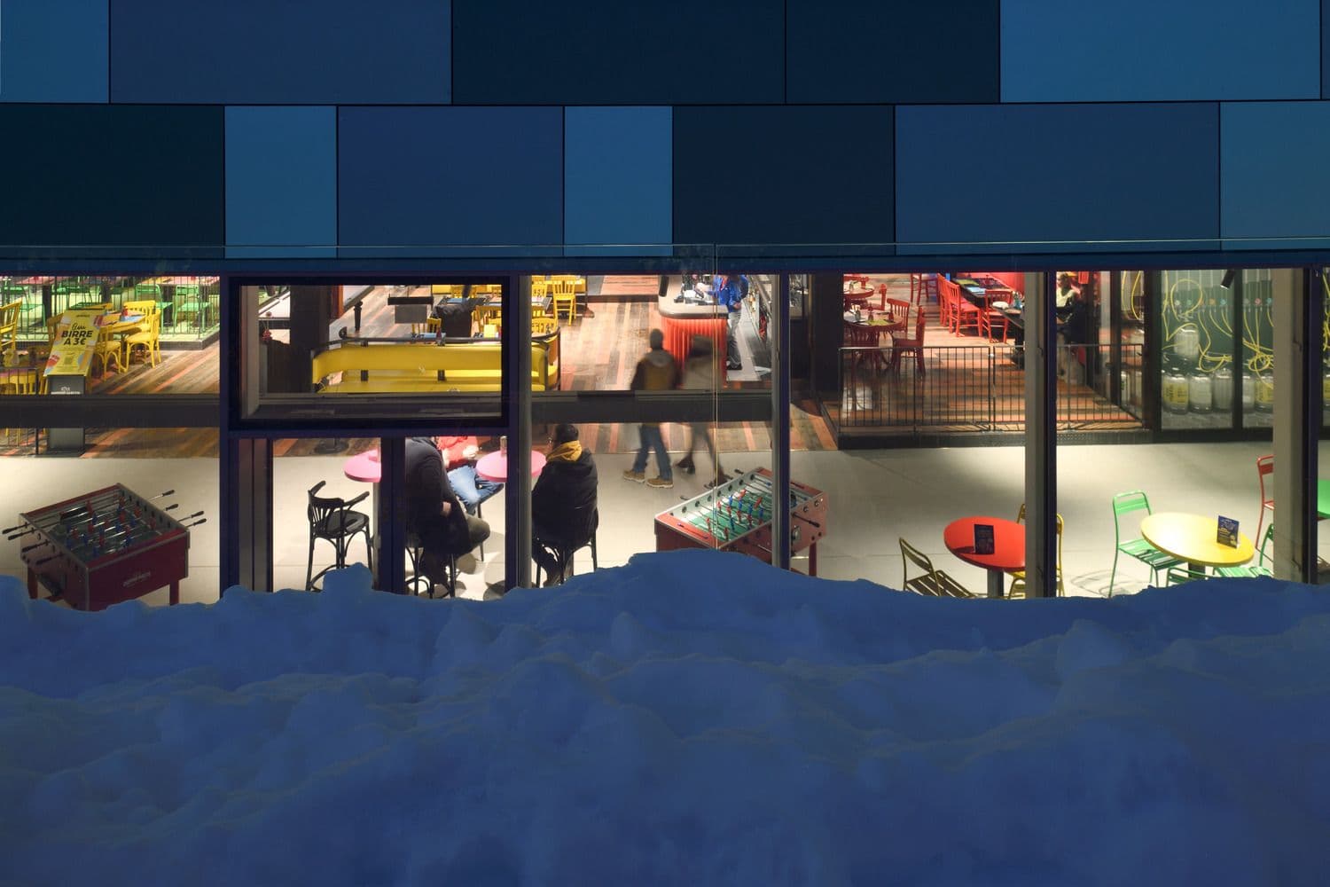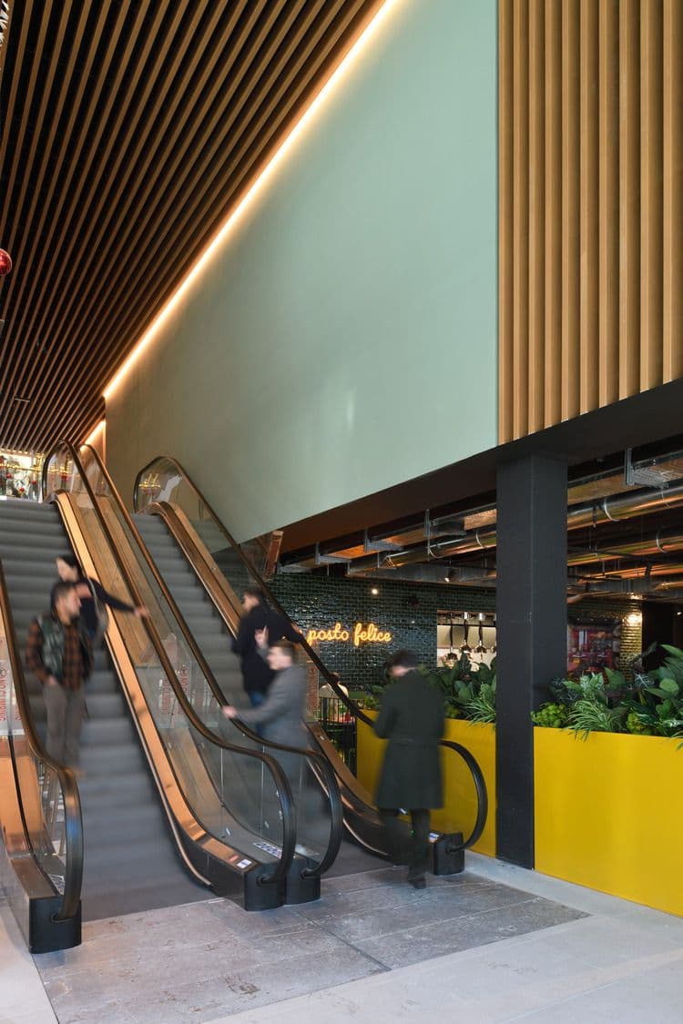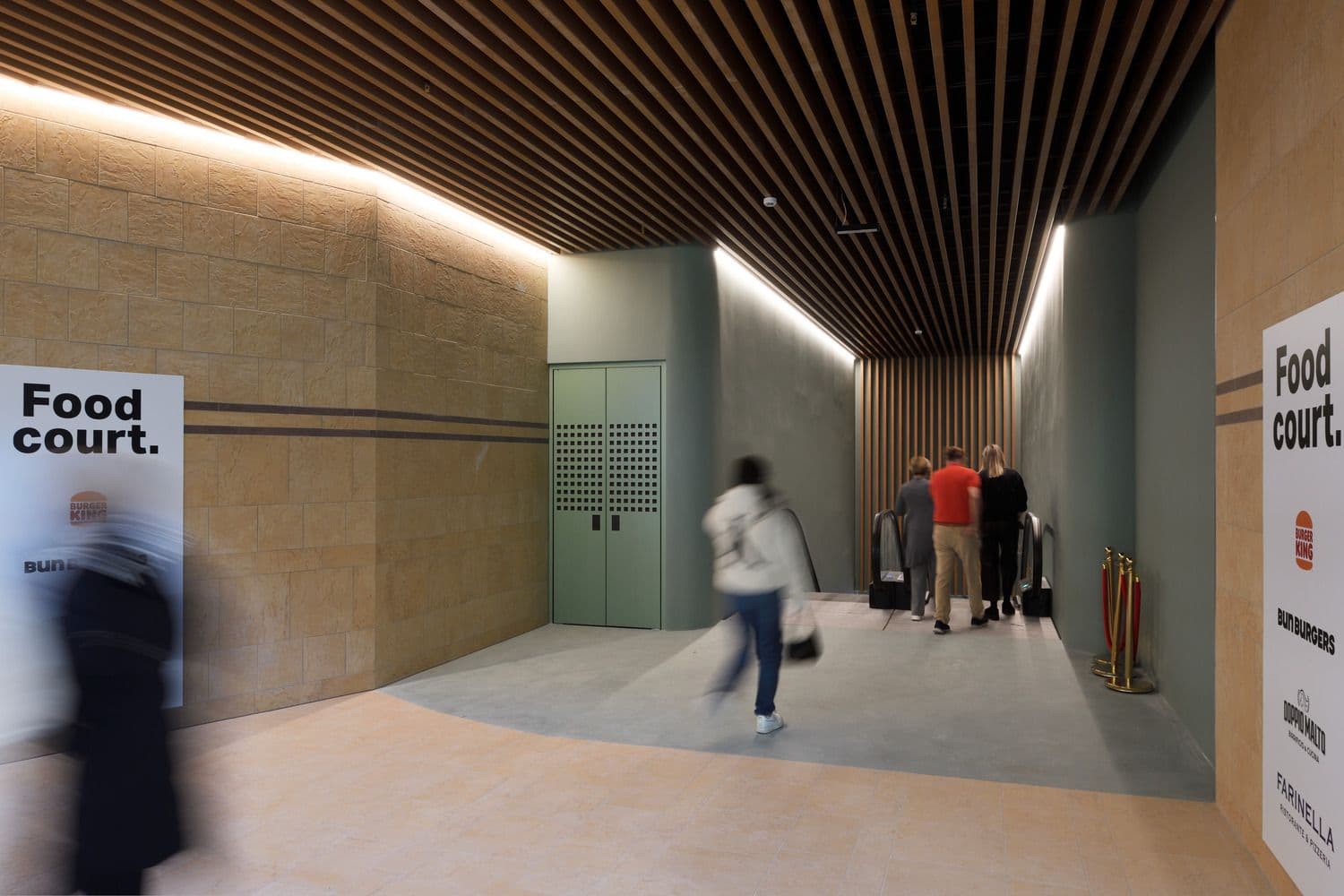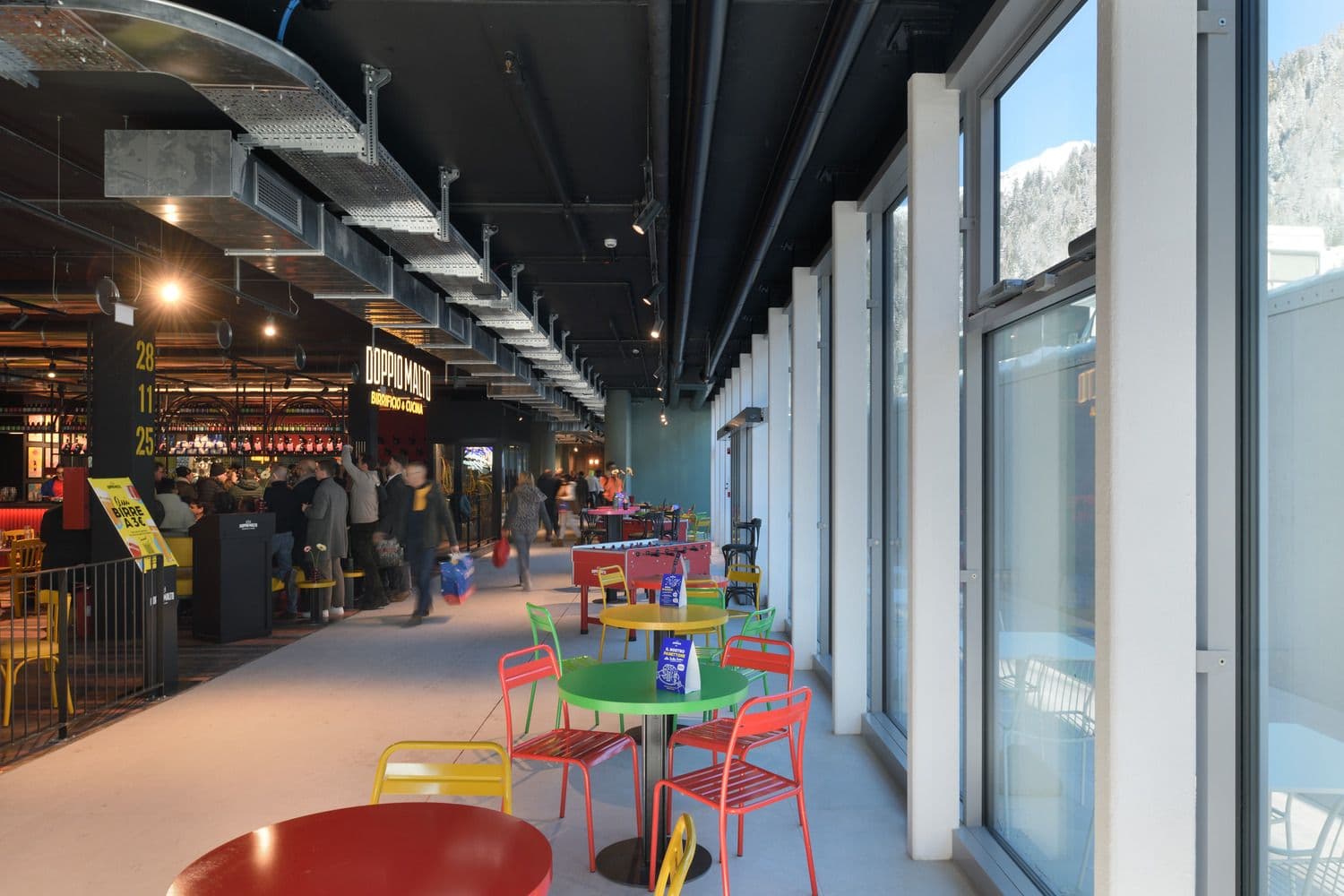 L’outlet dedica alla ristorazione e ai momenti di convivialità uno spazio a doppia altezza, direttamente affacciato sul paesaggio alpino grazie a 500 mq di pareti vetrate, che amplificano il rapporto tra interno ed esterno. Accanto alla food court si sviluppa la piazza ipogea, uno spazio raccolto e accogliente, avvolto da un’ampia gradonata polifunzionale. Questa scelta genera un nuovo livello di connessione, separato dal traffico stradale, e consente di aprire al paese il piano interrato, precedentemente cieco, oggi inondato di luce naturale. La food court porta beneficio anche agli altri brand dell’outlet: la sua posizione incentiva l’attraversamento dell’intera struttura, migliorando la visibilità delle attività commerciali e aumentando il tempo di permanenza dei visitatori.