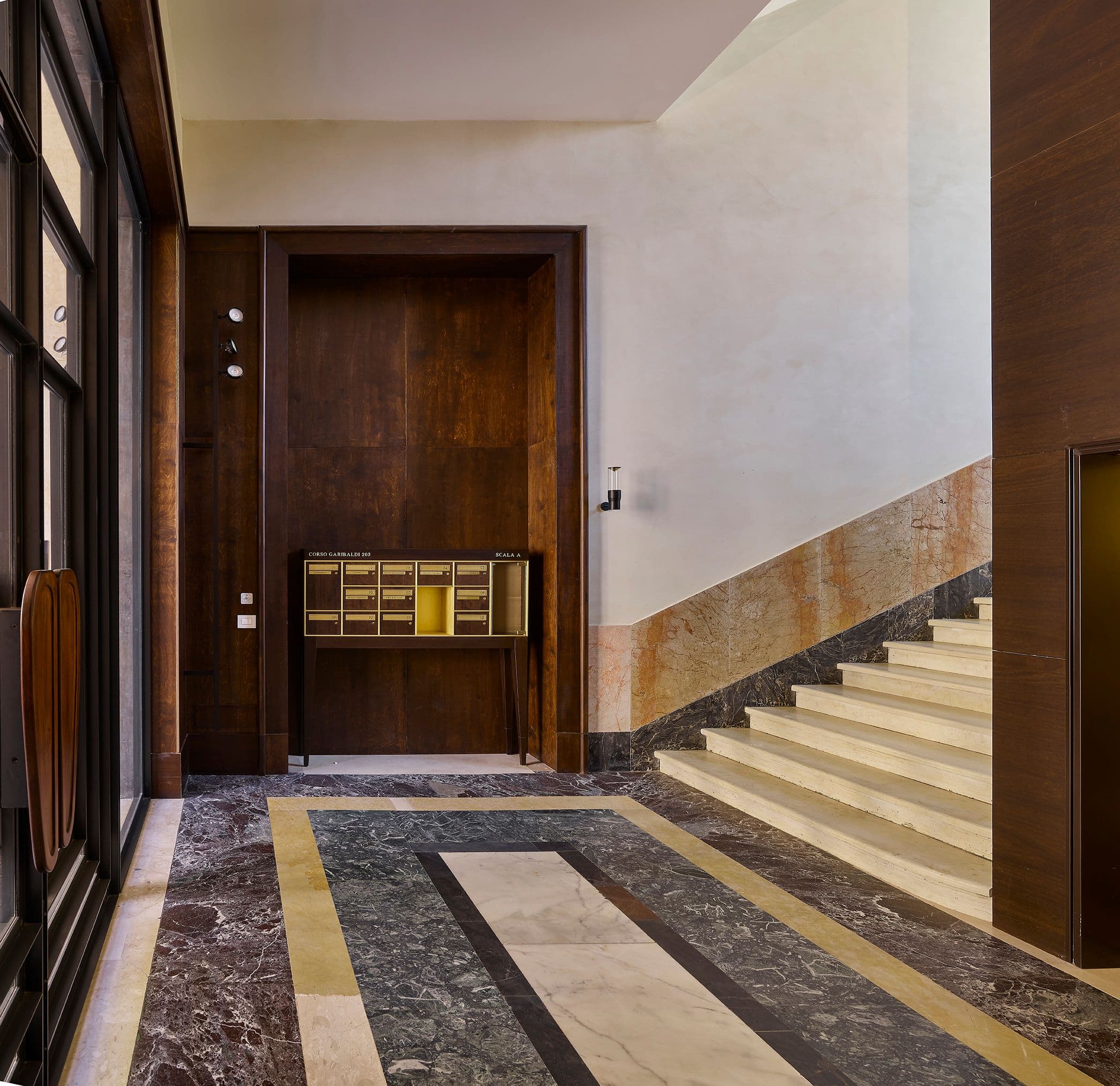 La scala principale è rifinita in seminato, l’ingresso presenta motivi déco in ferro e la decorazione si propaga a pianerottoli e corridoi, con illuminazione teatrale e finiture in marmo e ottone; le aree comuni riprendono materiali e decori preesistenti. Completano l’intervento un nuovo desk reception e il casellario postale.