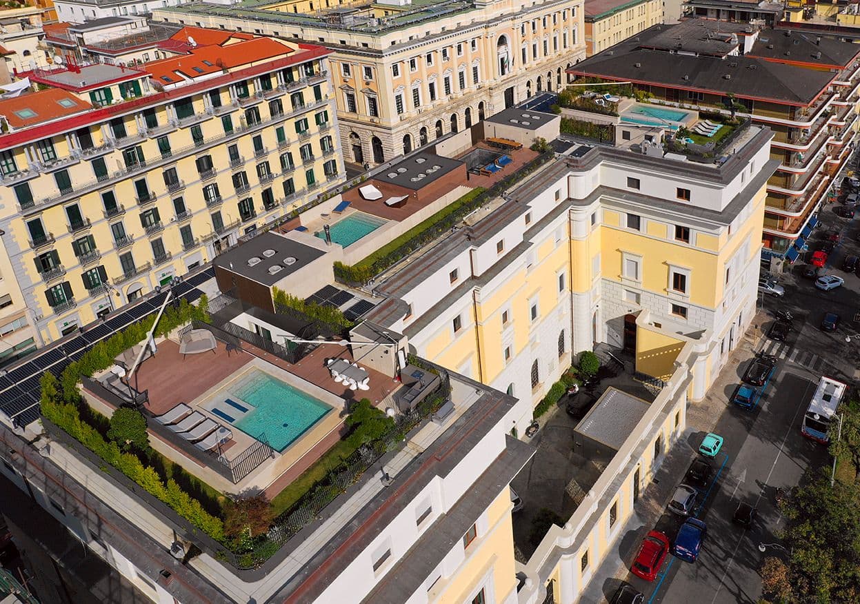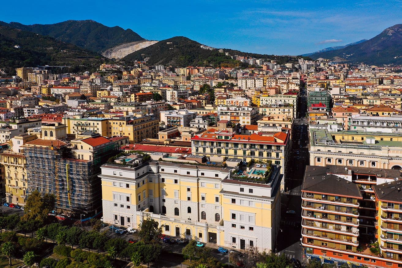 Per l’immobile storico e prestigioso con affaccio privilegiato sulla città di Salerno, la restituzione è di carattere filologico conservativa, soprattutto nella facciata e negli elementi decorativi dello spazio. La cura verso la rilevanza storica dell’edificio ne salvaguarda la prestigiosità.