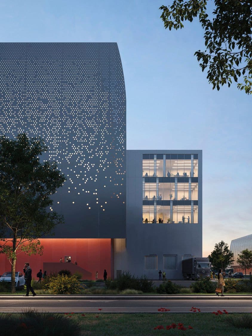 Le facciate neutre e uniformi sono interrotte dal basamento rosso per creare coerenza visiva con lo stile dei corpi di fabbrica preesistenti nella zona. Gli elementi tecnologici di copertura sono coperti con pannelli microforati retroilluminati che costituiscono una superficie in alluminio leggera, riflettente e semitrasparente, che alleggerisce l’impatto visivo e dona qualità estetica.