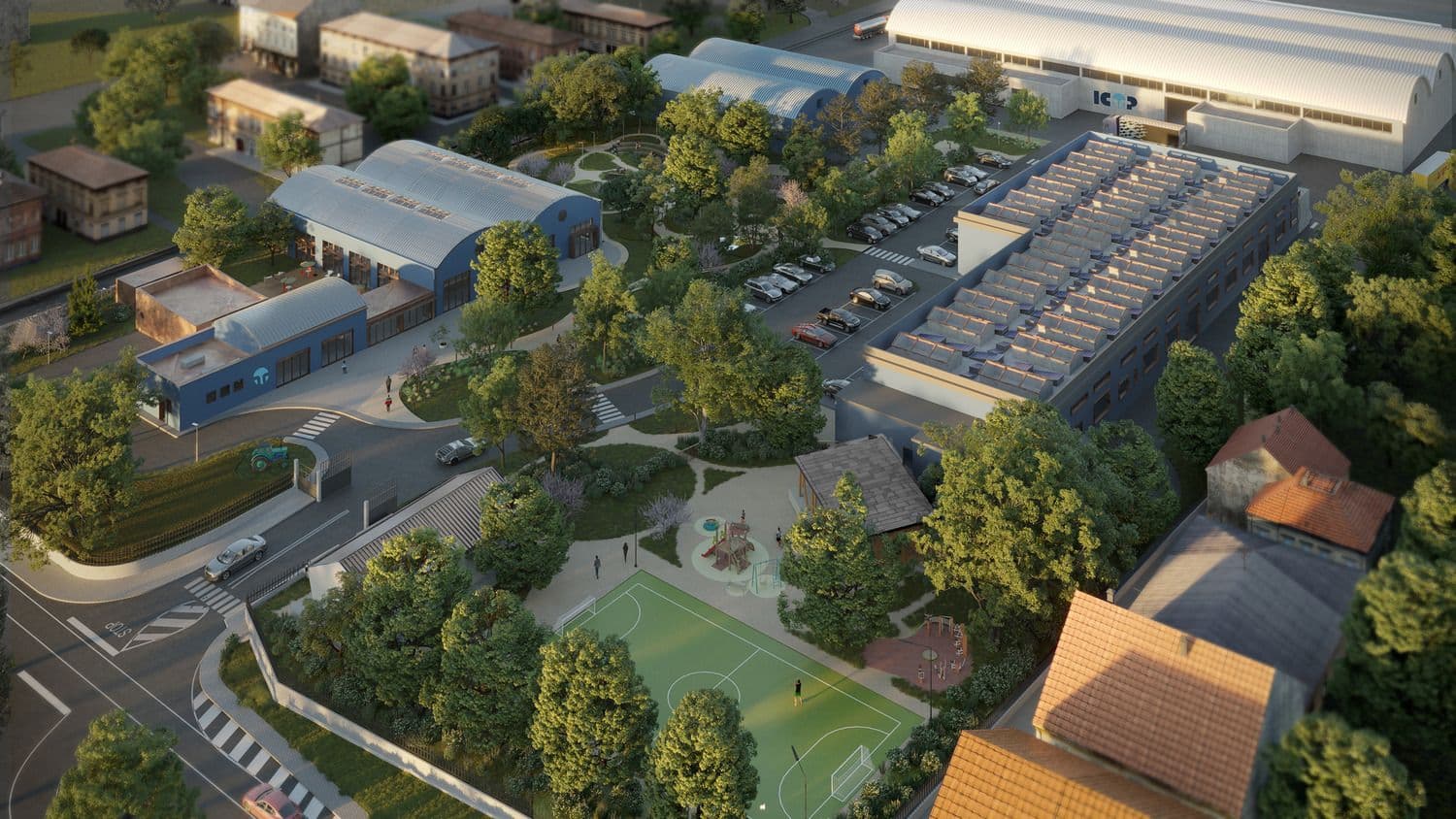 I nuovi uffici I.CO.P seguono principi ESG e valorizzano il patrimonio esistente, evitando nuovi volumi. L’area viene liberata dai manufatti dismessi, aumentando la permeabilità del suolo e creando ampie superfici verdi. La sostenibilità ambientale si concretizza con pannelli solari termici e fotovoltaici e raccolta delle acque piovane per irrigazione. Il parco, accessibile al pubblico, ospita spazi per eventi, installazioni artistiche e attività didattiche, rafforzando il legame tra azienda e comunità.