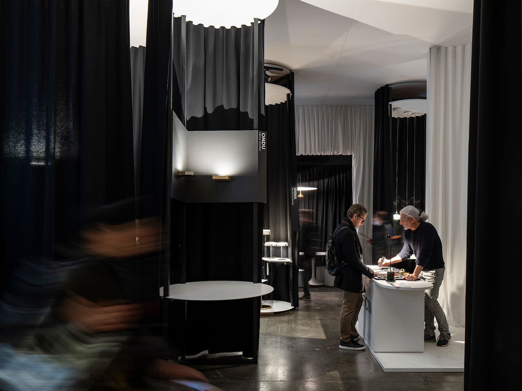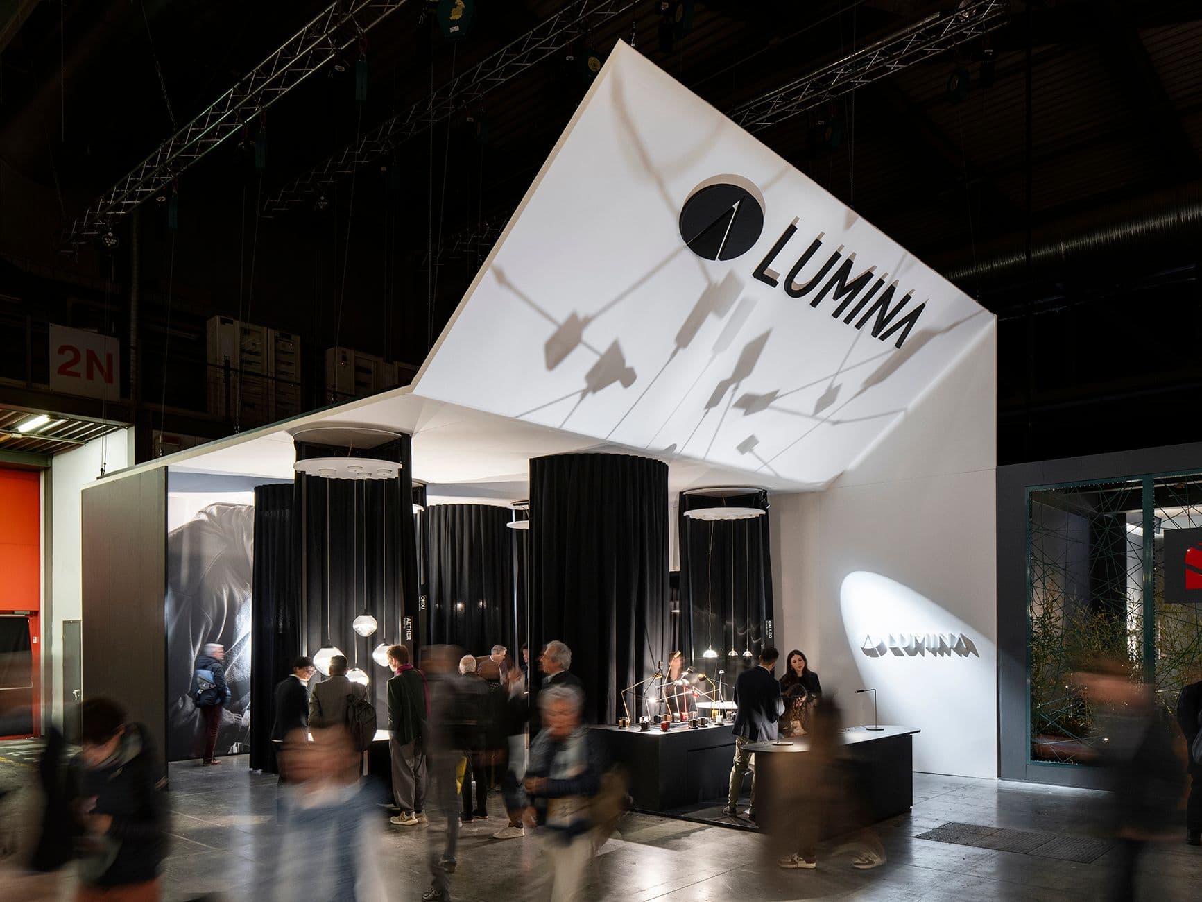 All’interno, grandi cilindri in tessuto nero ospitano le nuove collezioni, organizzate come quinte teatrali che rivelano gradualmente l’universo Lumina. Il percorso conduce all’Officina, dove un tecnico assembla e smonta gli apparecchi con cadenza regolare, mostrando i dettagli costruttivi e la qualità dei componenti. L’adozione del principio Zero-Pedana garantisce accessibilità totale e riduce i materiali superflui.