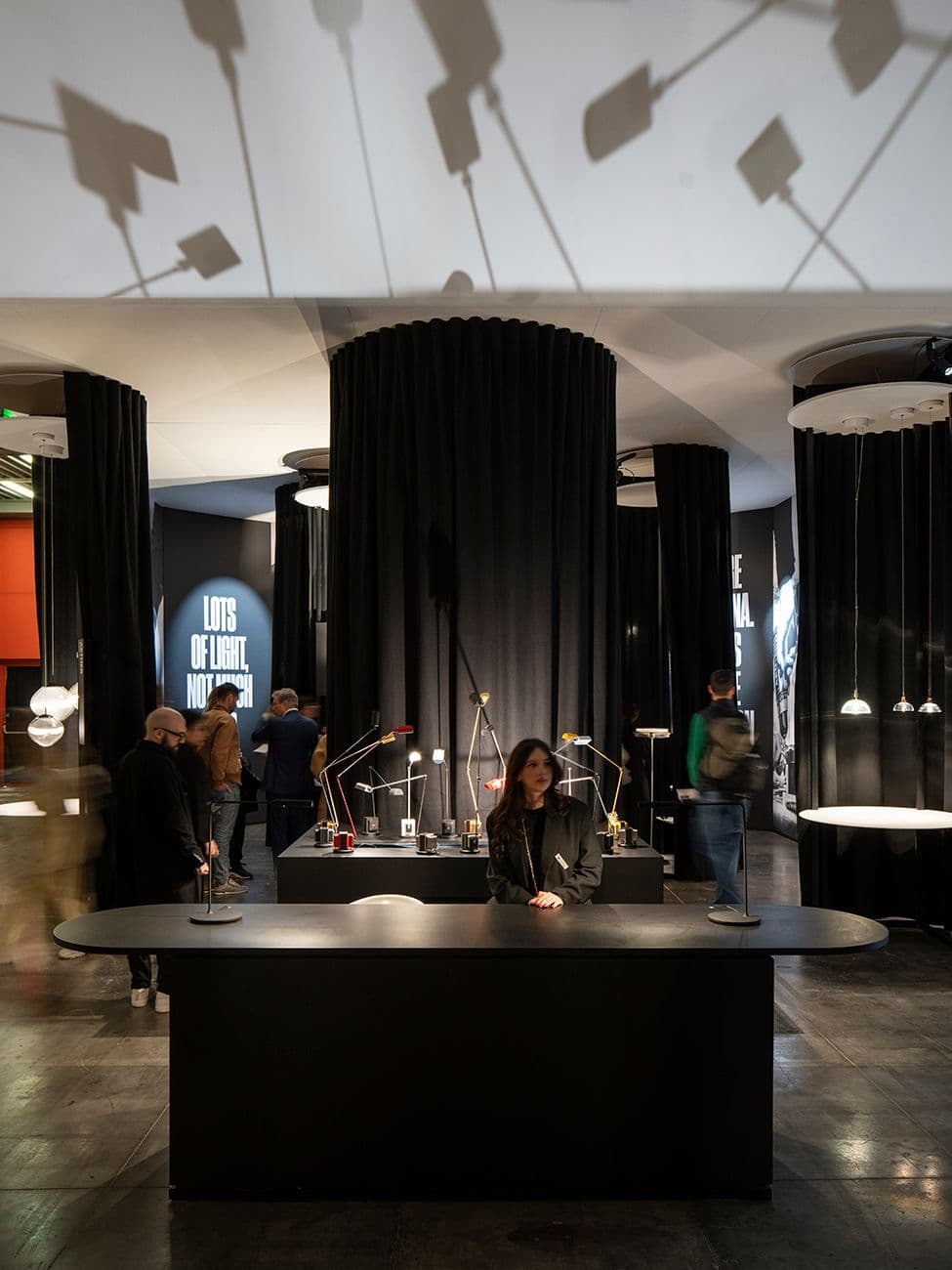 La struttura dell’allestimento è definita da una copertura inclinata che orienta lo sguardo verso l’ombra proiettata della lampada Daphine, elemento iconico del brand che rende lo stand riconoscibile a distanza.