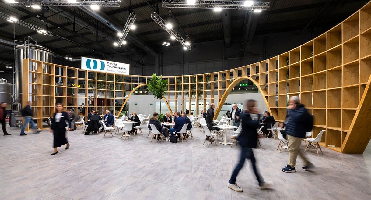 Il masterplan e l’allestimento dello stand Omnia danno forma a uno spazio completamente riconfigurabile dove tecnologia, materiali naturali e branding dialogano.