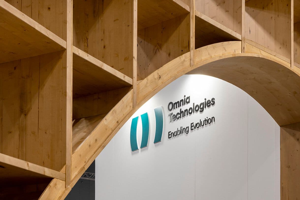 L’ambiente è realizzato interamente in legno e concepito come una tela bianca, personalizzabile e capace di evolvere nel tempo. Il layout si ispira alle curve del logo Omnia e si articola in tre aree modulari, caratterizzate dall’uso di materiali ecologici e dall’inserimento di piante che sottolineano la vocazione green del brand. Al centro, un grande schermo digitale e una composizione di cubi comunicativi creano un’esperienza immersiva pensata per coinvolgere e stupire ogni visitatore, integrando estetica, tecnologia e attenzione alla sostenibilità.