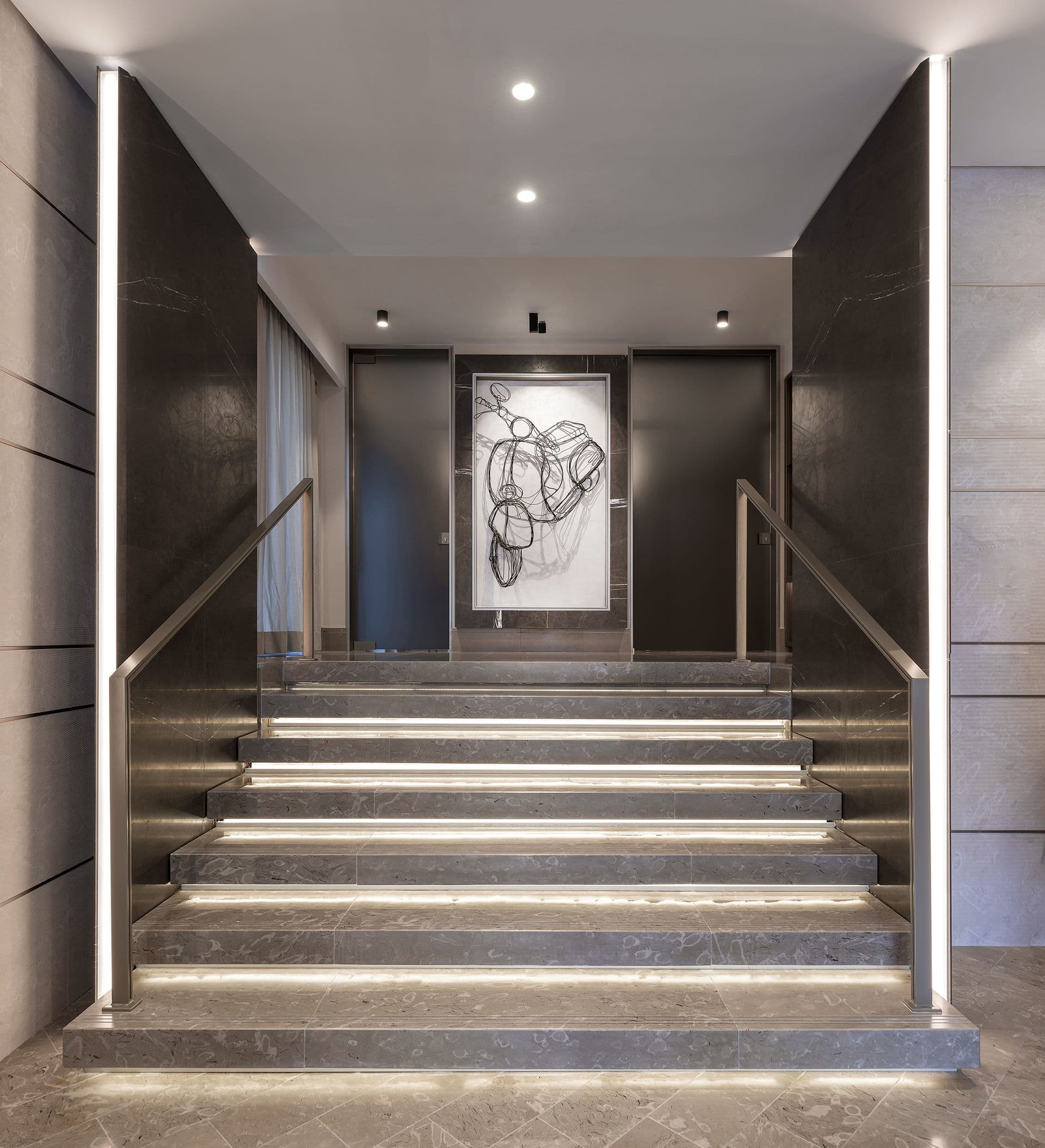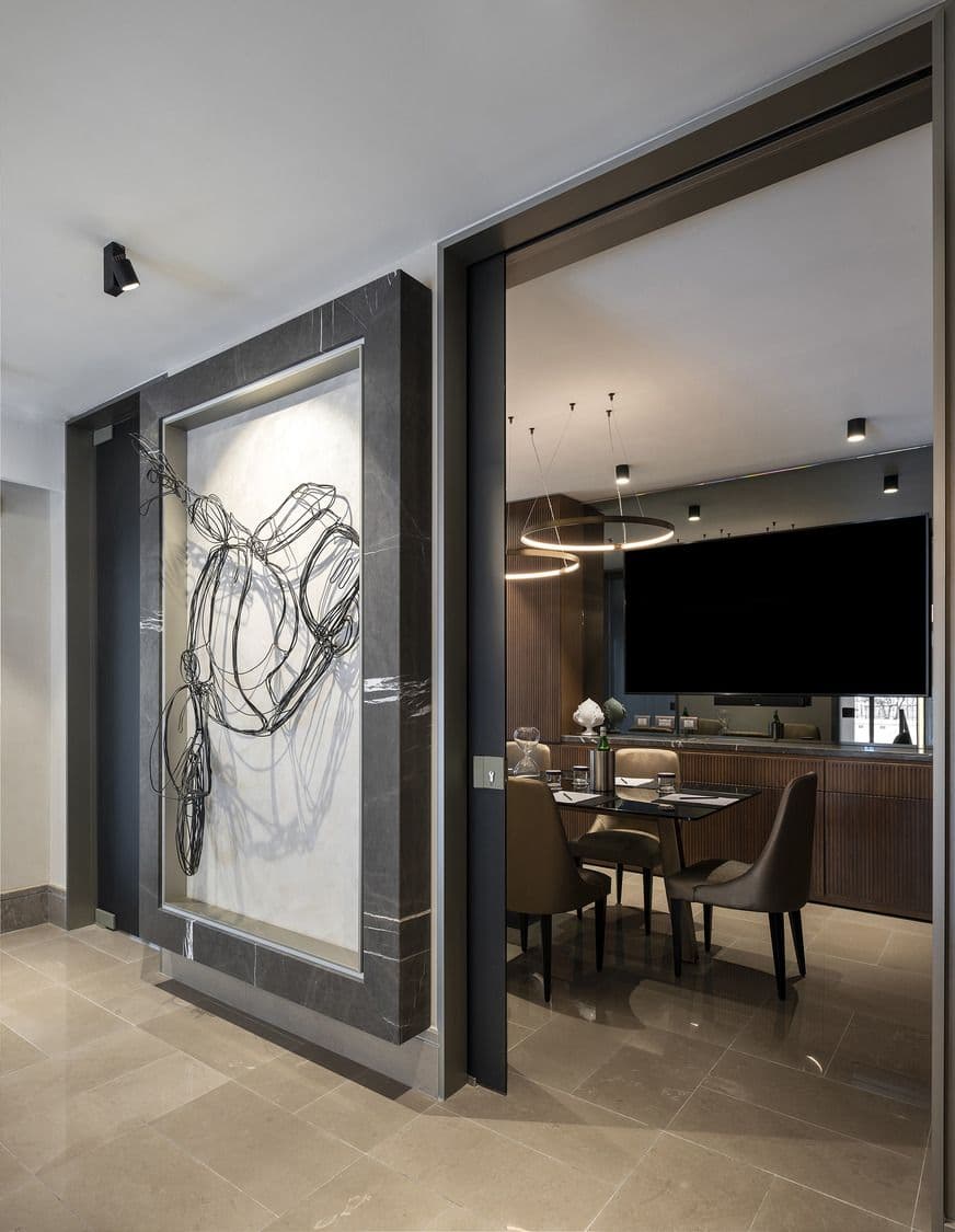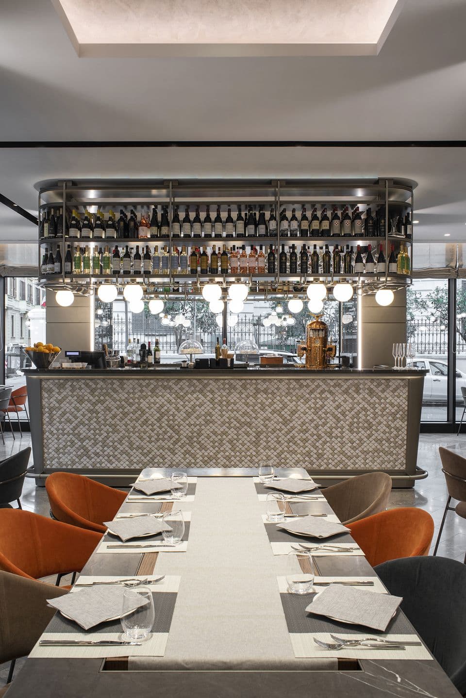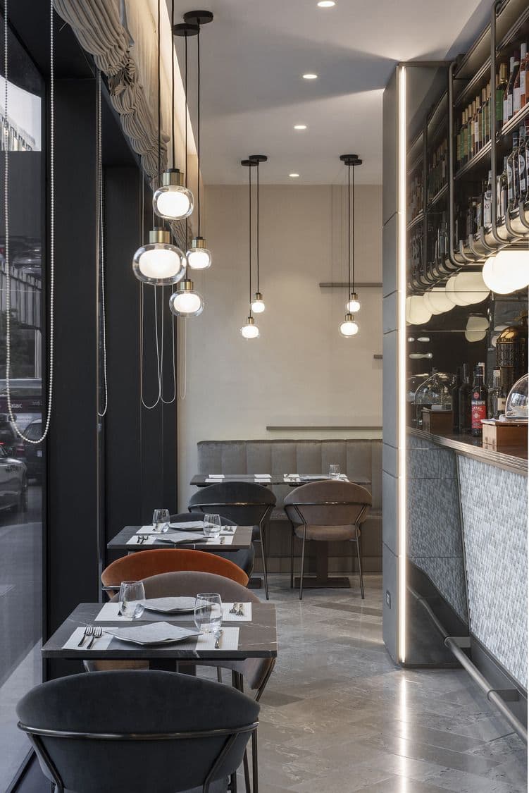 Il fulcro dell’ambiente interno è il bar Atmosfera, posto al centro dello spazio, che catalizza l’attenzione per le luci, la bottiglieria a vista e lo scenografico bancone che comunica con il grande tavolo centrale con bordo in marmo, dando vita a un dialogo tra materiali e stili affini. Foyer e sala da pranzo sono inoltre impreziositi dalle sculture in fil di ferro di Alessandro di Cola.