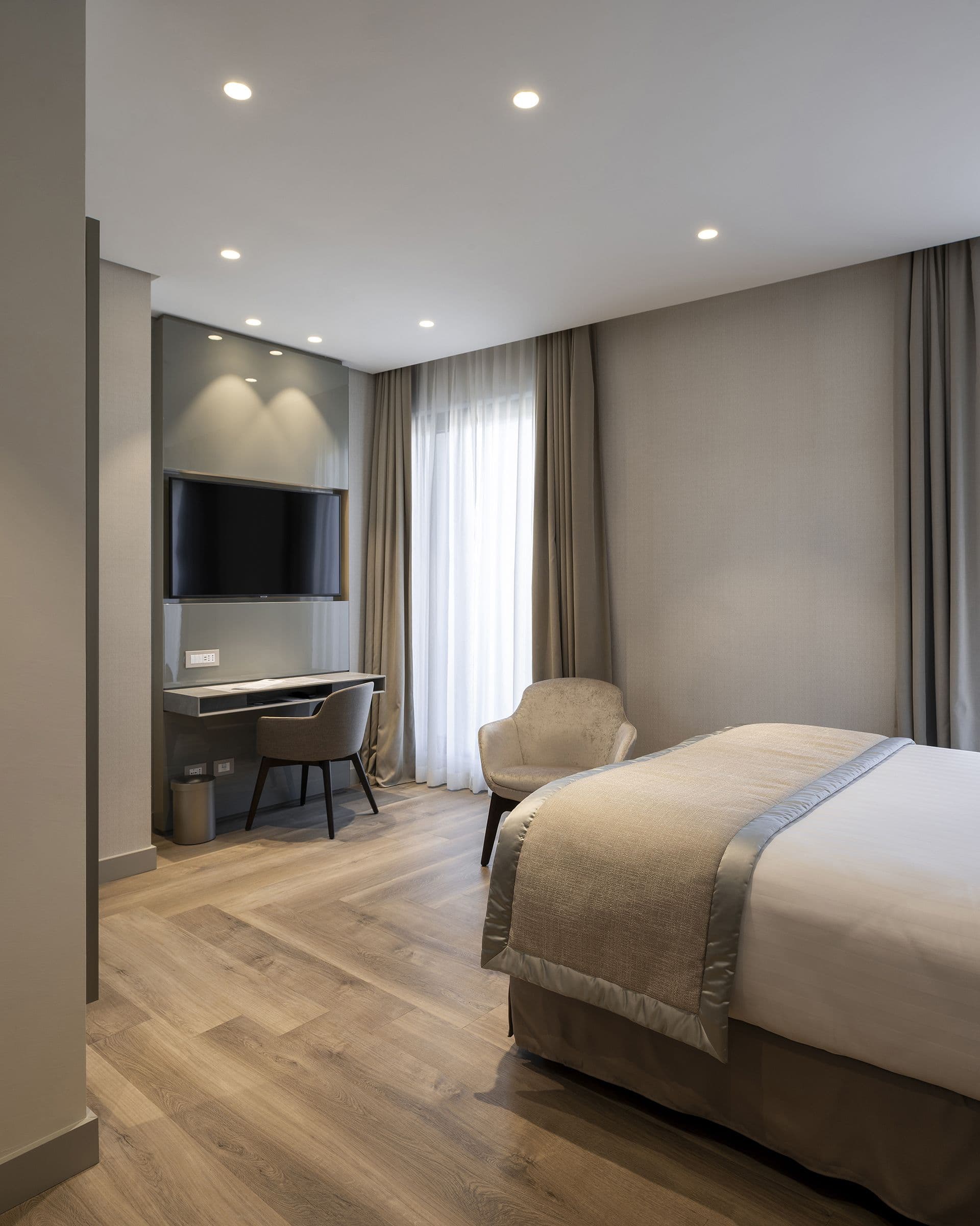 La posizione strategica nel cuore di Roma e la storia dell’edificio hanno guidato lo sviluppo del concept, insieme alla volontà di conferire allo spazio un carattere riconoscibile, capace di rendere l’esperienza dell’utente realmente unica. La Dolcevita degli anni Cinquanta e Sessanta è evocata dalle linee grafiche decise e dai pattern geometrici degli arredi, a cui vengono accostate forme morbide e colori neutri che, nelle camere, si traducono nelle scelte di finiture, materiali, illuminazione, effetti tattili e visivi. Tutti gli elementi sono pensati per valorizzare la ricchezza storica dell’edificio tramite l’intervento di ristrutturazione.