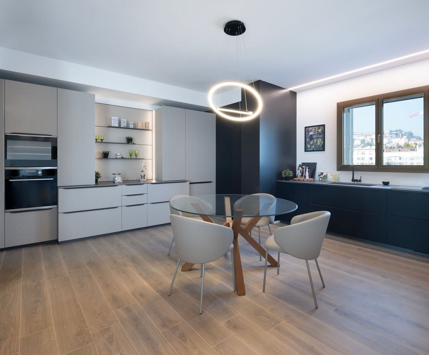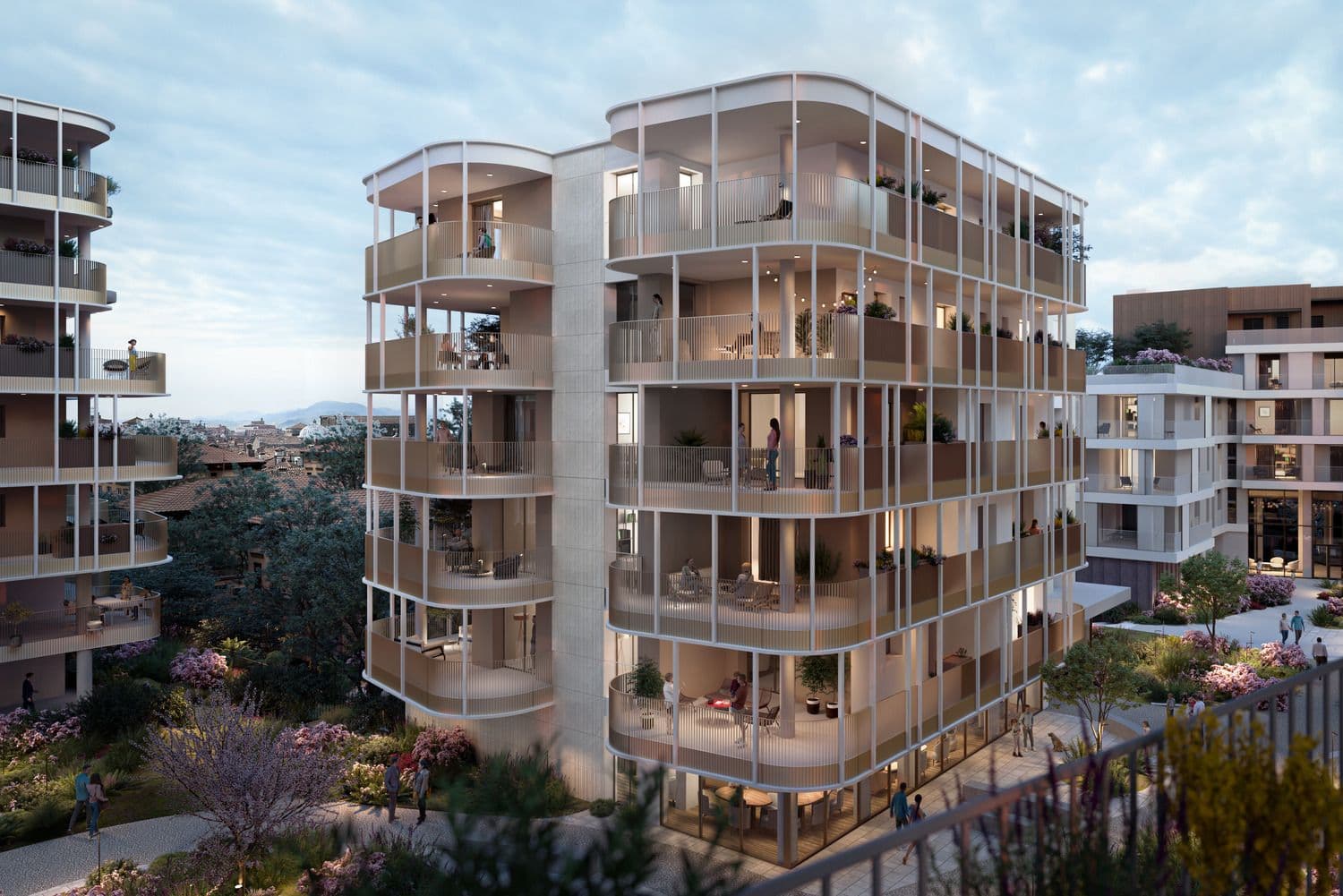 Le facciate interne si aprono verso la corte con un sistema di logge e pareti vetrate, mentre le due torri riflettono il parco e lo portano all’interno dello spazio domestico tramite grandi aperture che favoriscono la condivisione tra unità abitative.