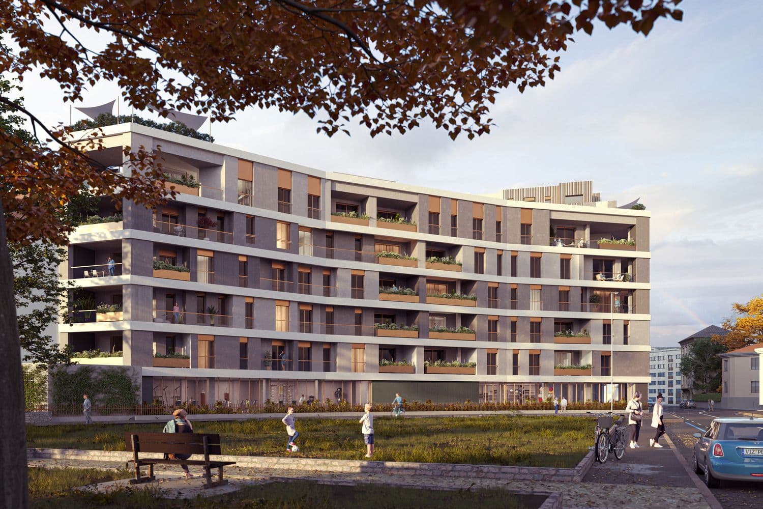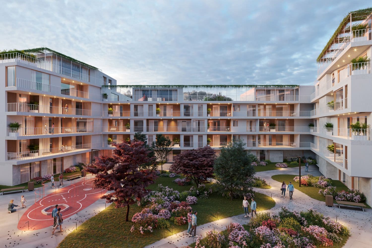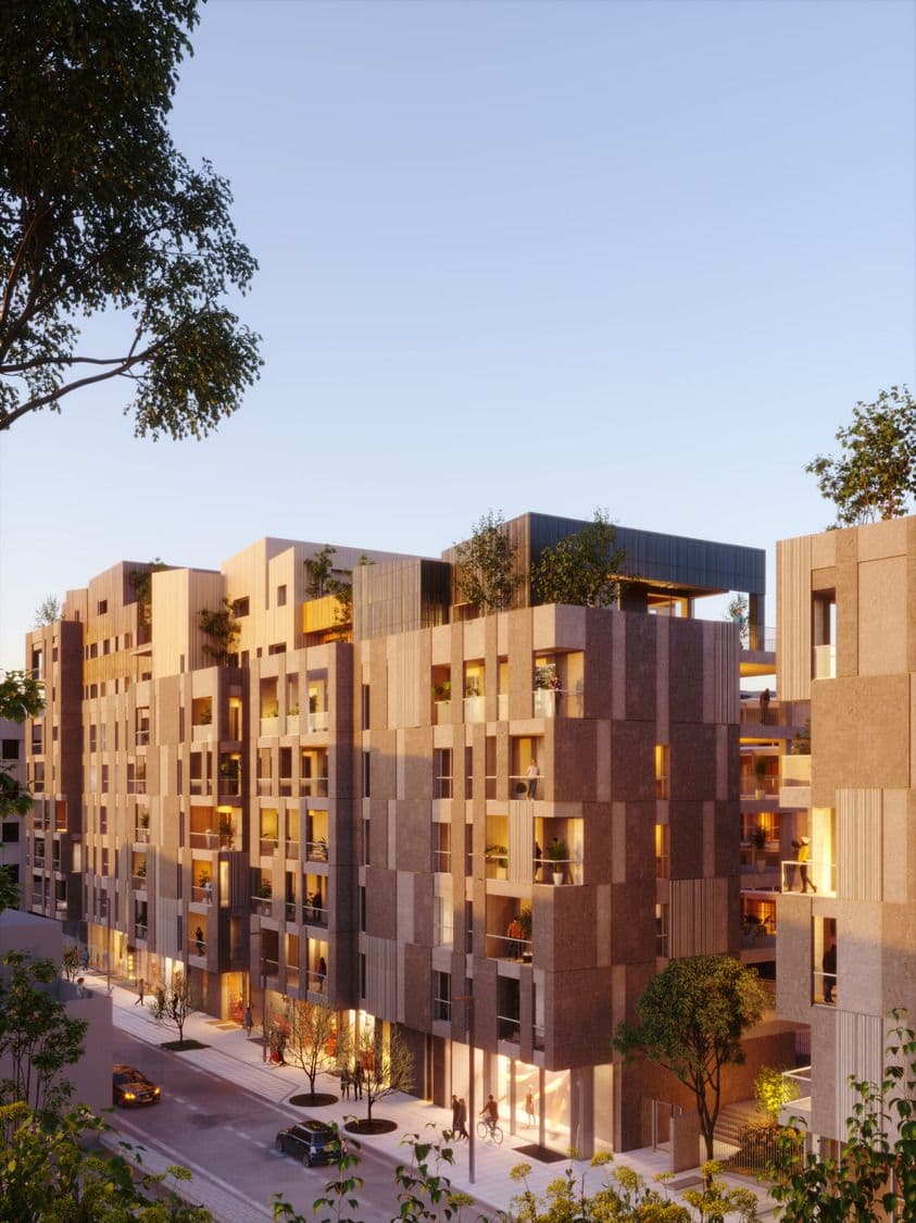 Il fronte urbano si connette con il contesto storico dell’area ex Italcementi, conservata tra corti interne e logge che creano un dialogo tra edifici e parco condiviso.