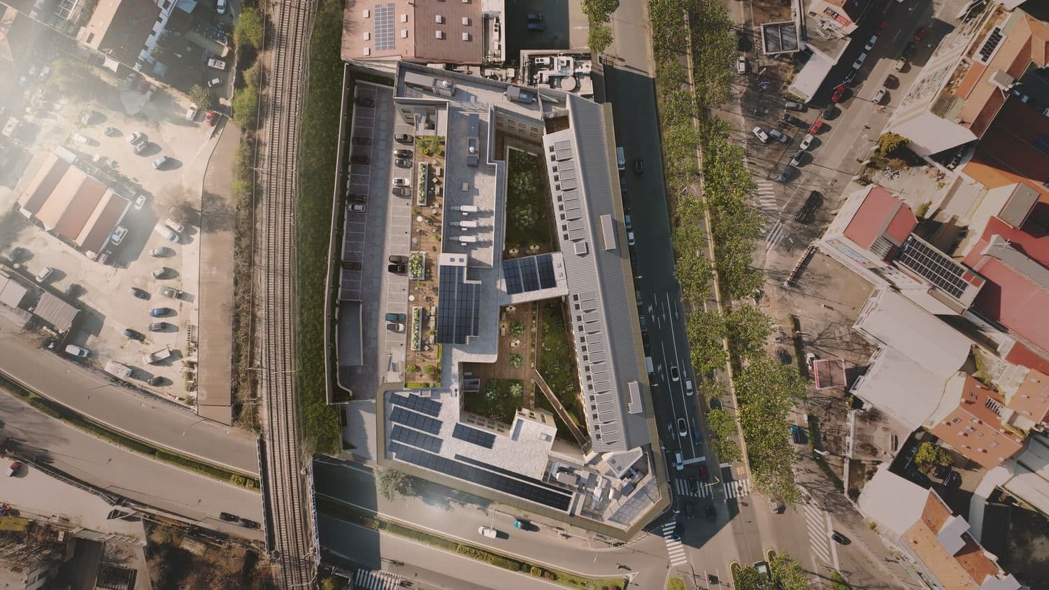 Il cuore del progetto è rappresentato dalla piazza interna pavimentata in legno affiancata da una terrazza praticabile; nella piazza, le alberature e il giardino integrano un sistema di filtraggio per l’acqua piovana.