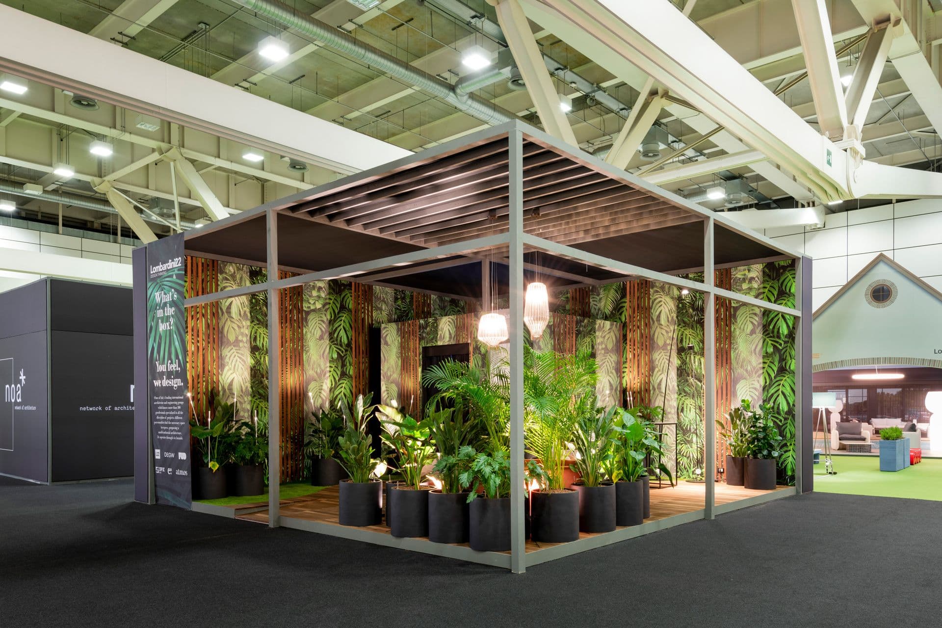 Lo spazio unisce una lounge verde e accogliente a un volume specchiante raccolto, offrendo ai visitatori una pausa sensoriale dal ritmo della fiera.